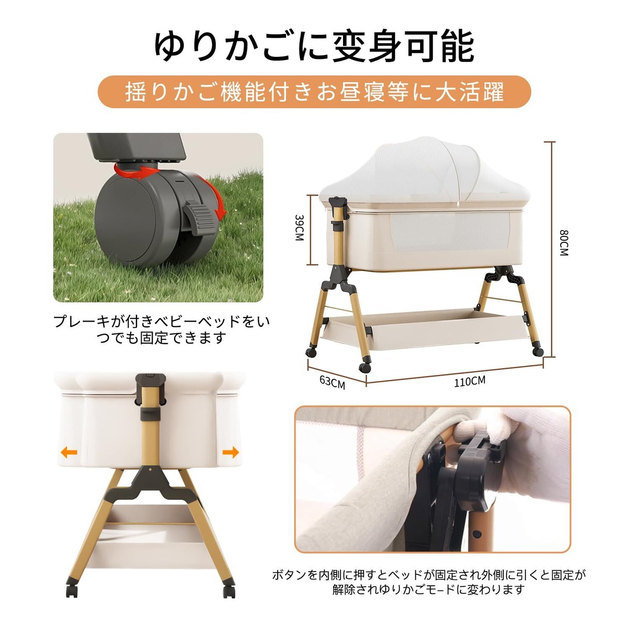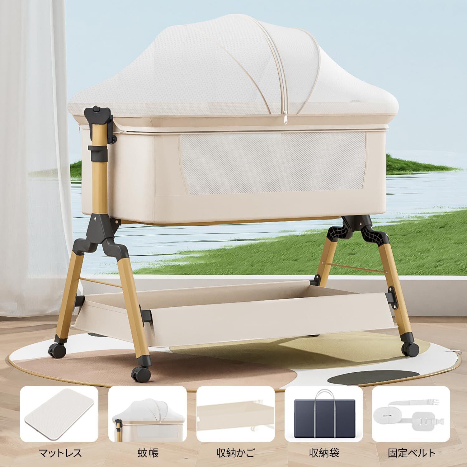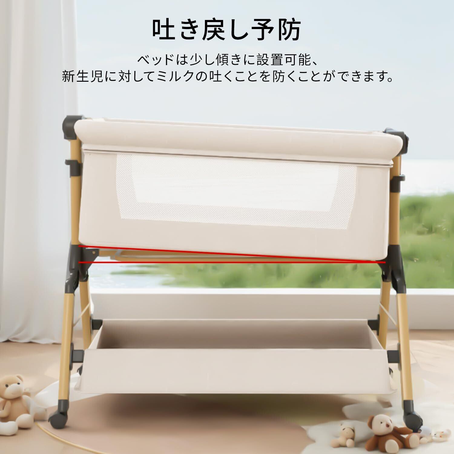 【高さ調節可能・ゆりかごに変身可能】高さ3段階調節可能で、各高度の大人ベッドにくっつけてご利用可能です。ーベッドは斜めの調節可能で、新生児に対してミルクの吐くことを防ぐことができます。三角形の構造+ 4点ポジショニングサポートはピラミッドと同じくらい安定しています。固定ベルト付き、大人ベッドから離れを防ぐ、くっつける可能、更に安定、安心。揺りかご機能付き、わずかな揺れで赤ちゃんはすぐに眠りにおちます。