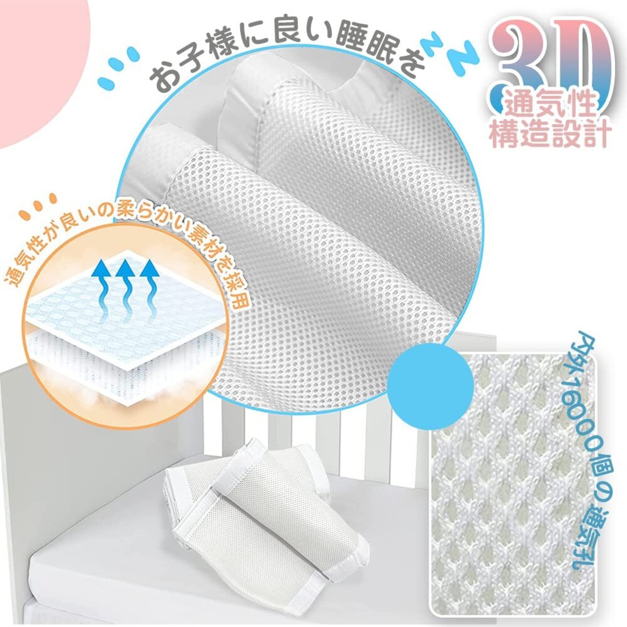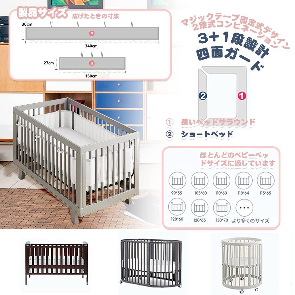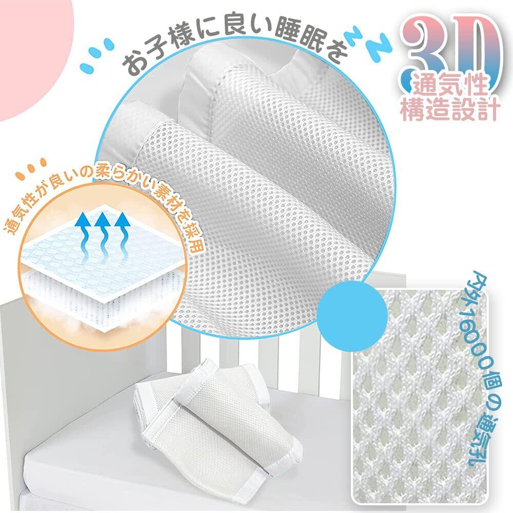 【通気性設計&高品質】:3D立体時通気網穴設計,空気循環を加速させ、湿気と蒸し暑さを簡単に除去し、赤ちゃんに快適でスムーズな呼吸を提供することができるからです。ベッドガードの内外には16000個の通気孔があり,赤ちゃんの鼻がベッドフェンスにくっついていても,赤ちゃんの呼吸の心配はない。高品質素材で作られて、柔らかくて快適で、速乾性、通気性が抜群、赤ちゃんのお肌に優ししくて、長くご愛用ができます。通気性メッシュ生地、低刺激性ポリメッシュ生地、従来のバンパーに安全です。