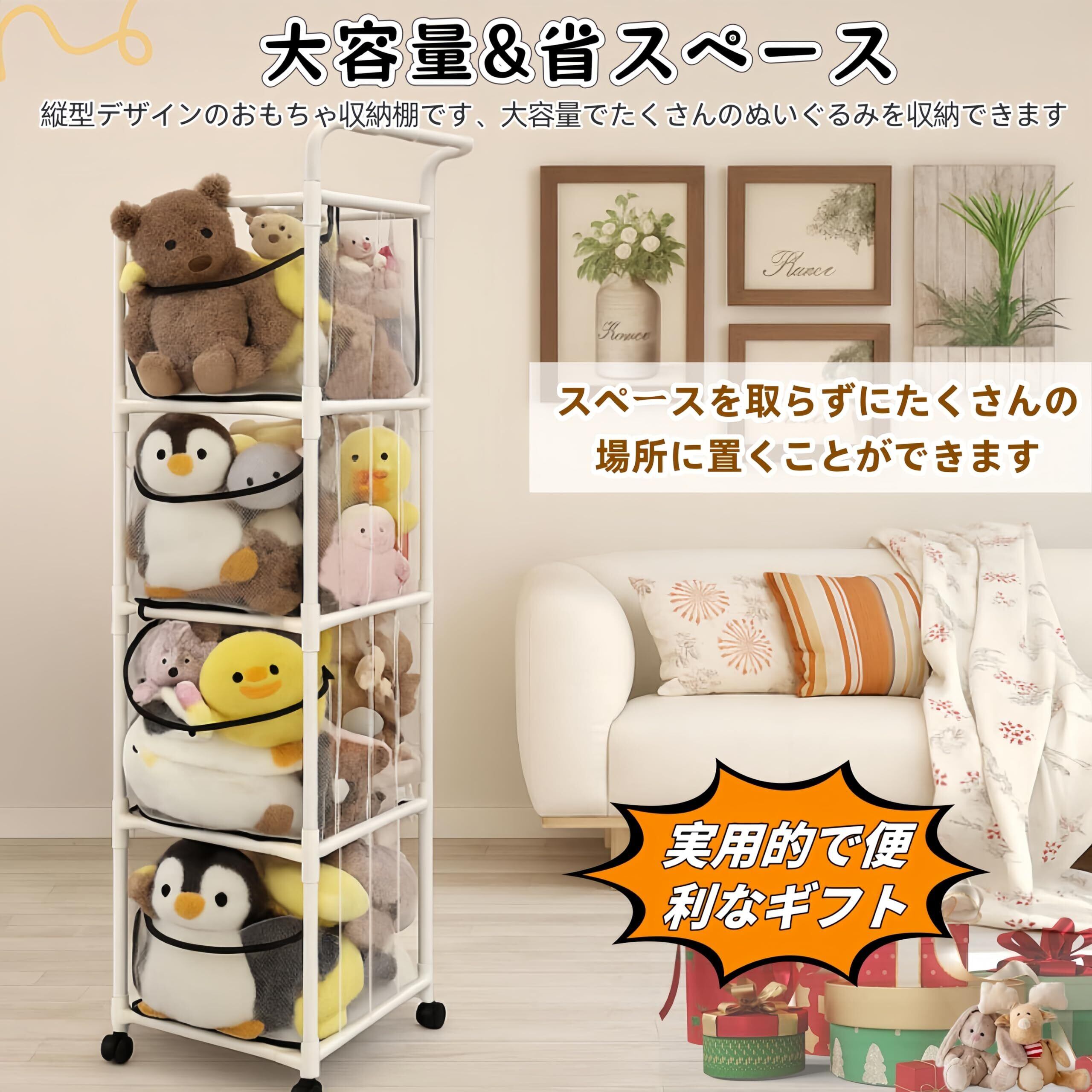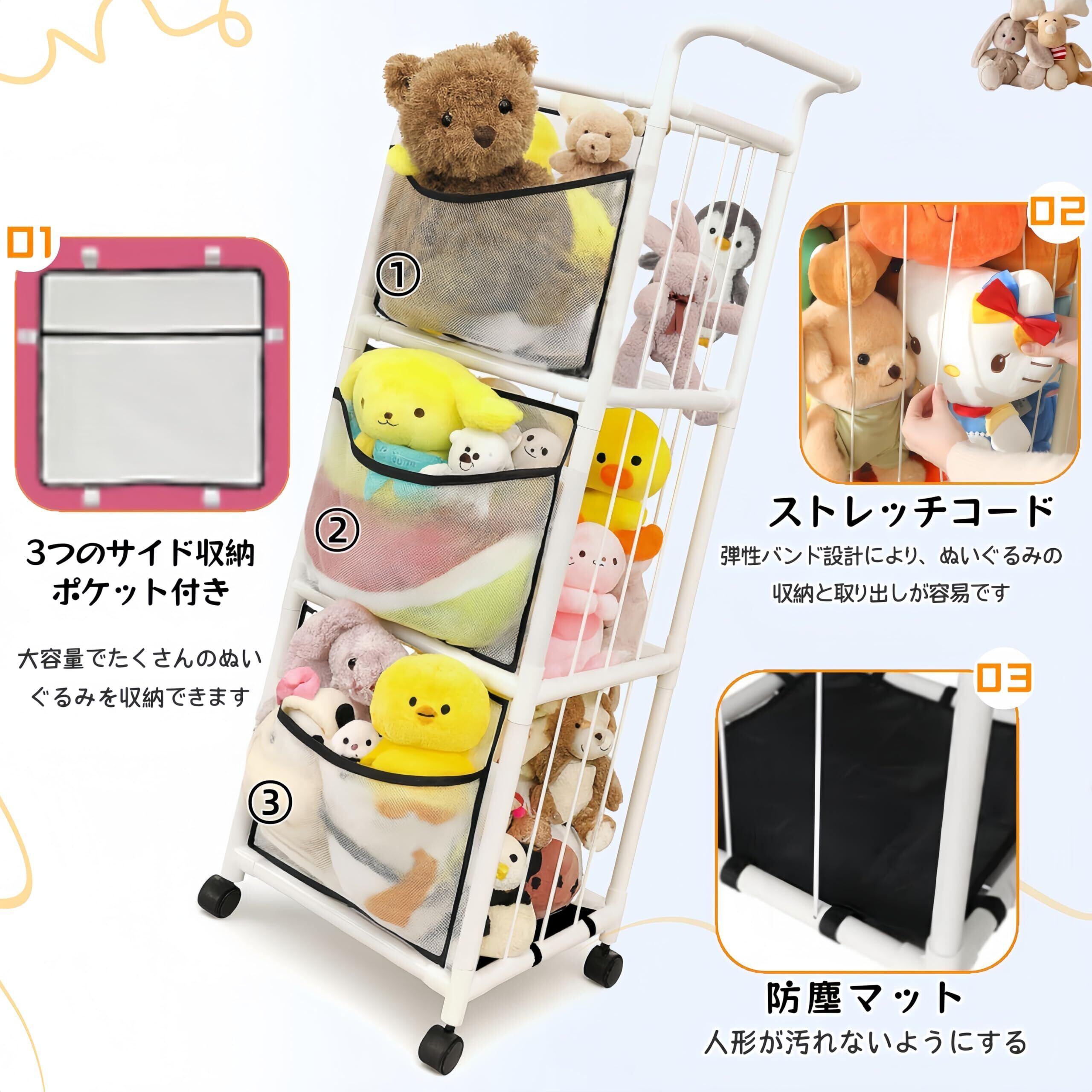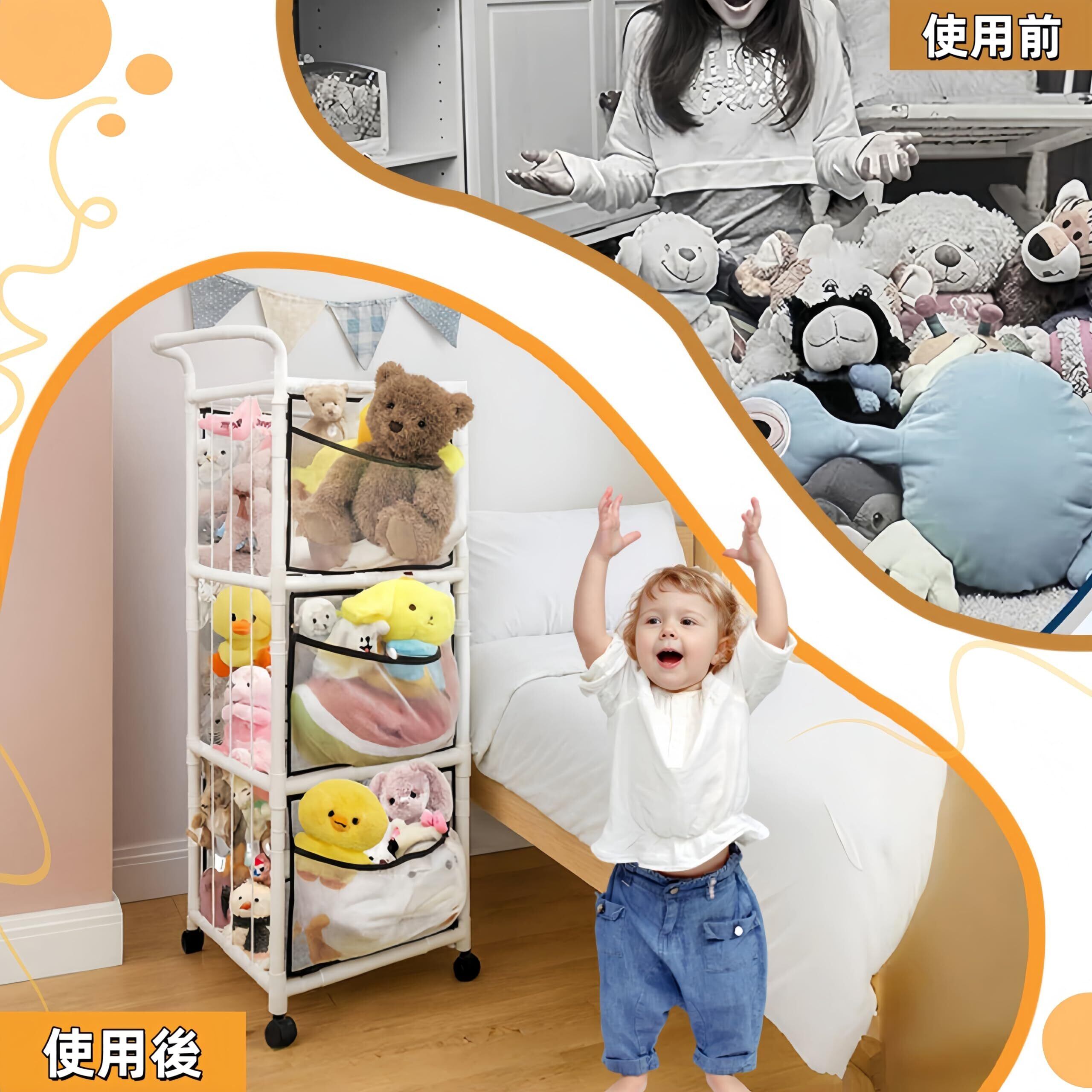 【大容量収納】縦型デザインのおもちゃ収納棚です。3つのサイド収納ポケット付き、大容量でたくさんのぬいぐるみを収納できます。伸縮性のあるストラップはぬいぐるみの保管と取り出しが簡単になるように設計されています。スペースを取らずにたくさんの場所に置くことができます。