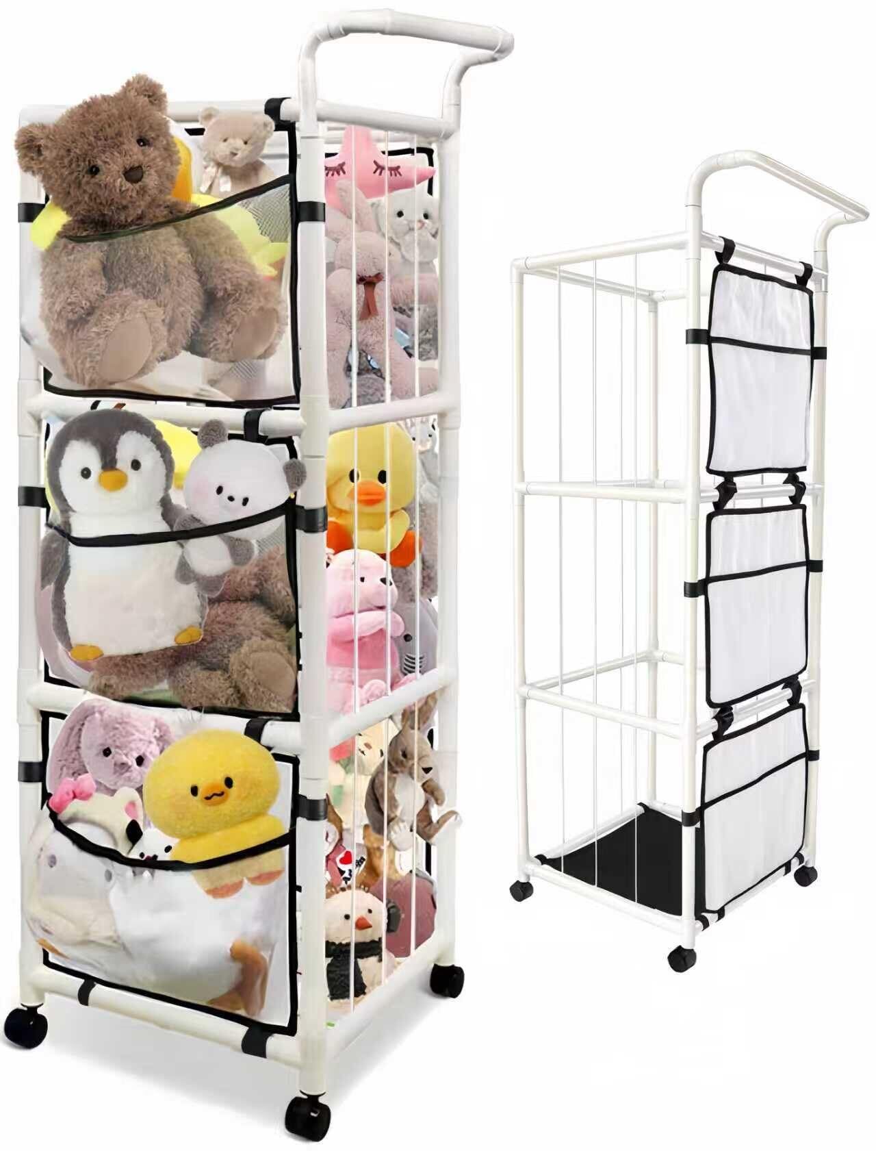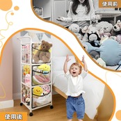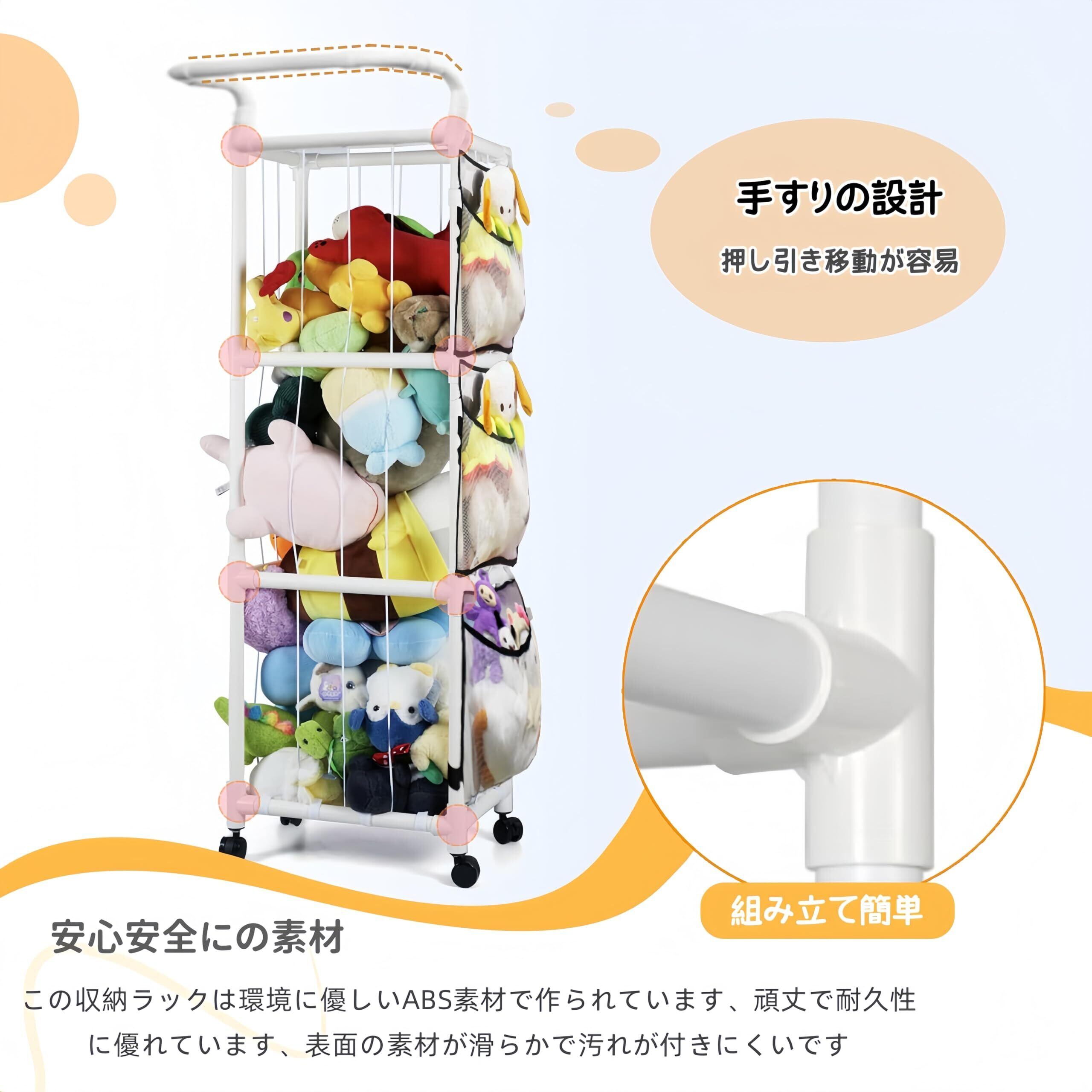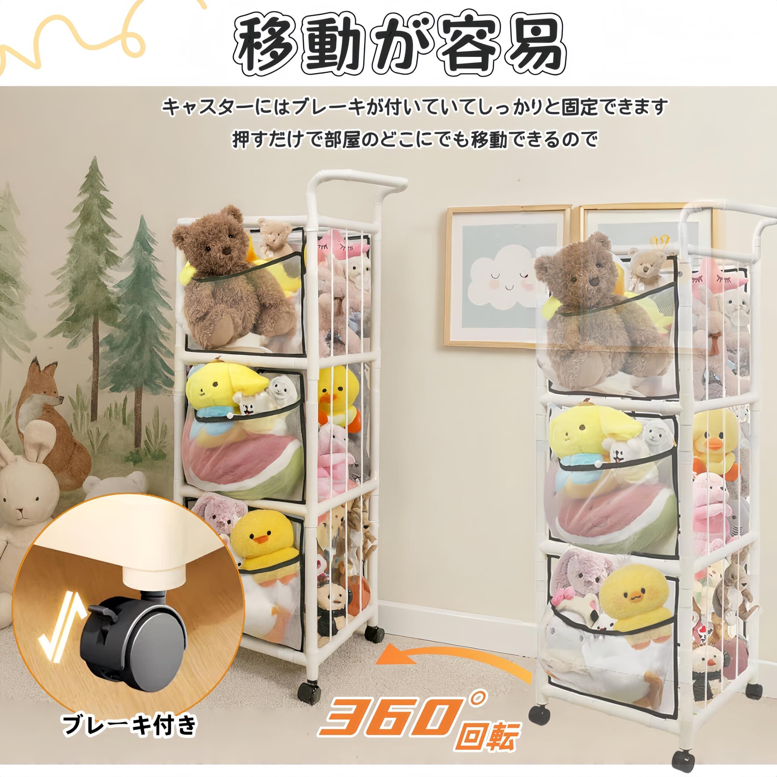 【大容量収納】縦型デザインのおもちゃ収納棚です。3つのサイド収納ポケット付き、大容量でたくさんのぬいぐるみを収納できます。伸縮性のあるストラップはぬいぐるみの保管と取り出しが簡単になるように設計されています。スペースを取らずにたくさんの場所に置くことができます。