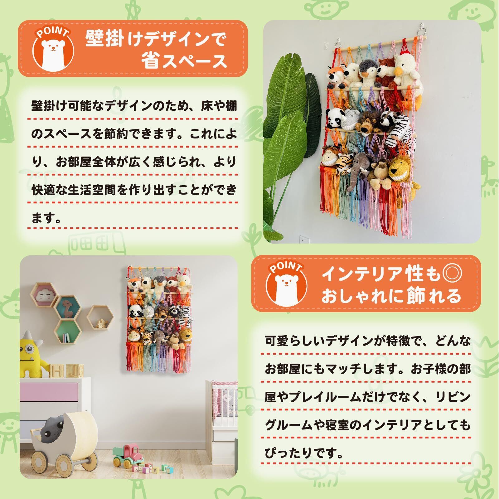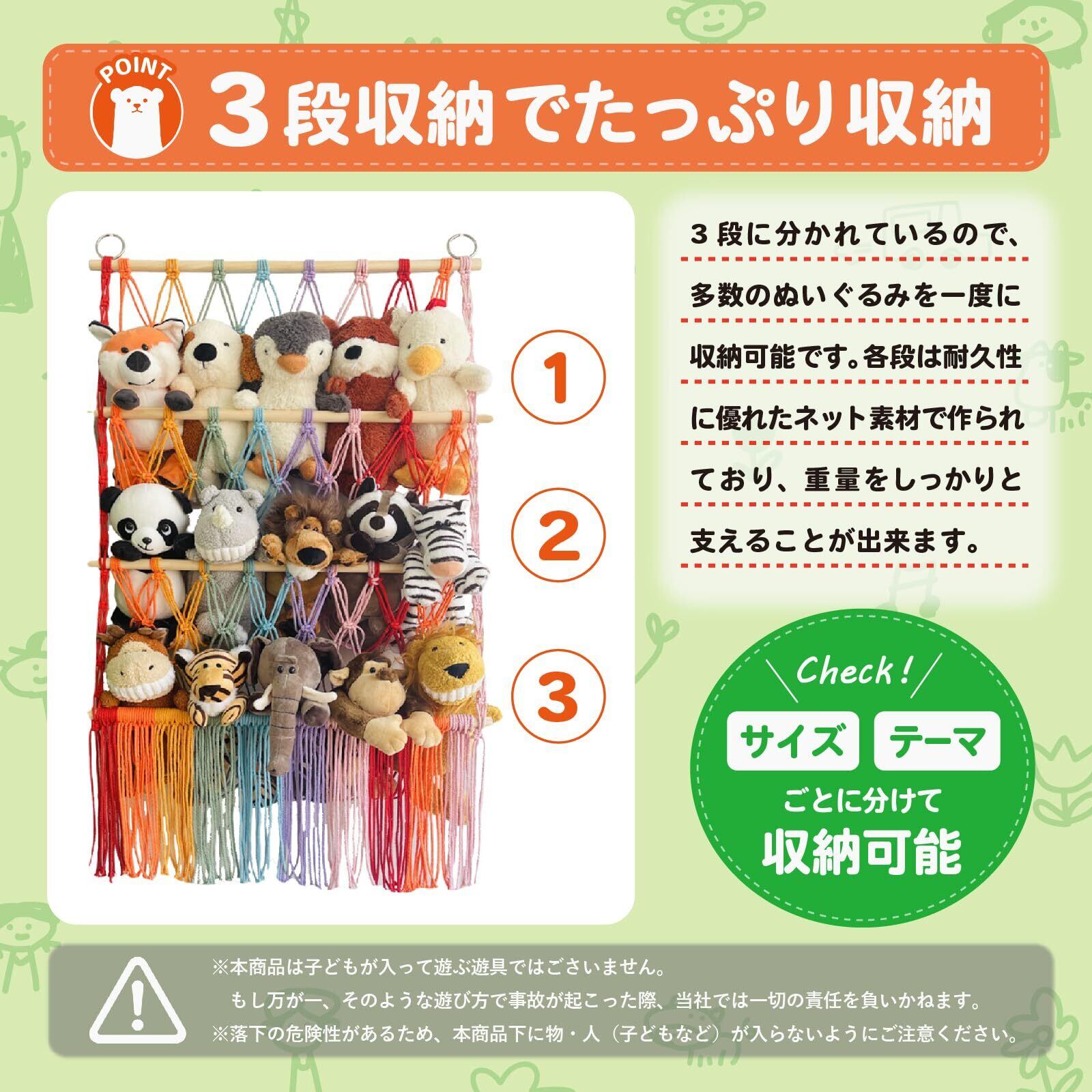 【3段収納でたっぷり収納】このぬいぐるみ収納ハンモックは3段に分かれており、多数のぬいぐるみを一度に収納可能です。 各段は耐久性に優れたネット素材で作られており、重量をしっかりと支えることができます。お気に入りのぬいぐるみを整理するだけでなく、サイズごとやテーマごとに分けて収納することも可能です。