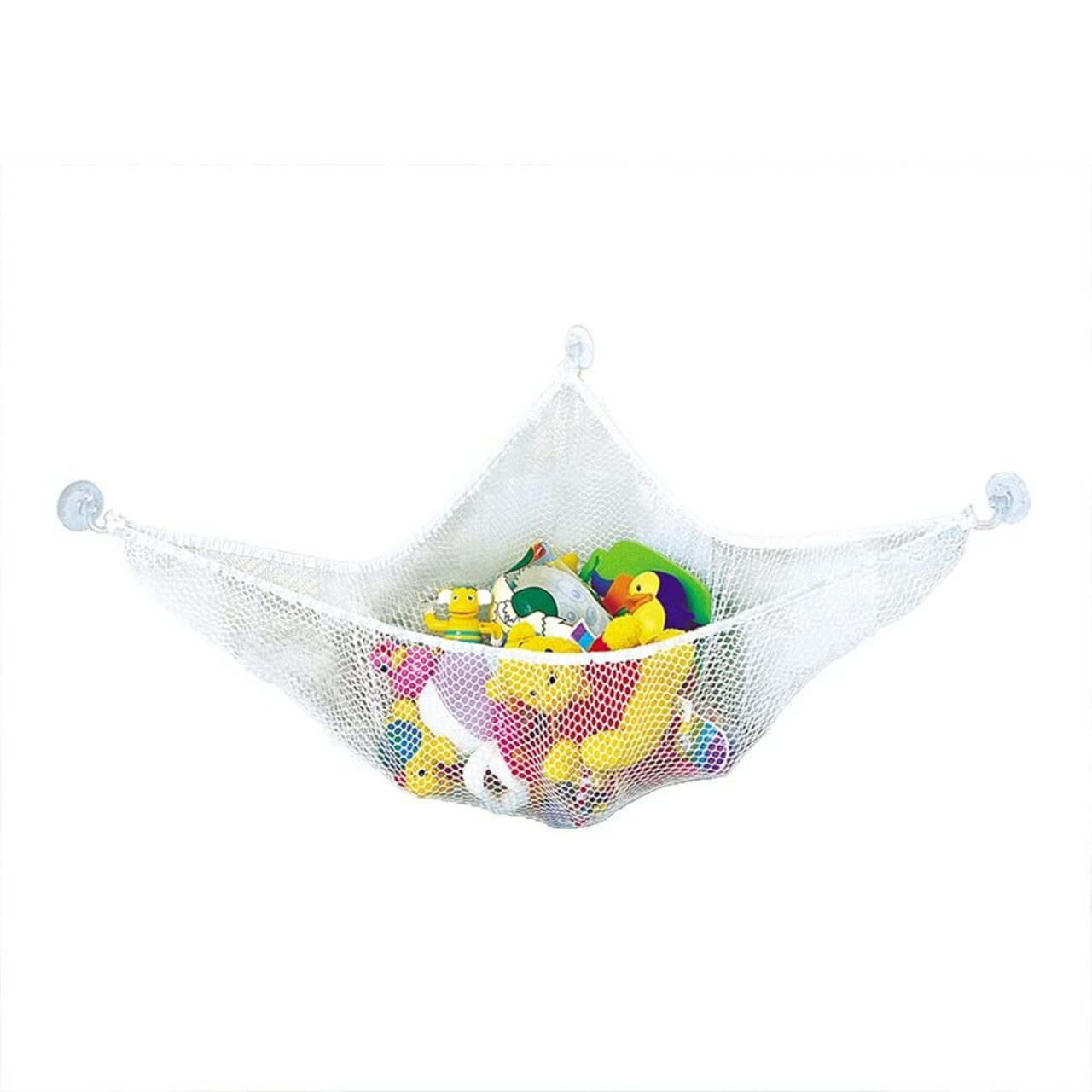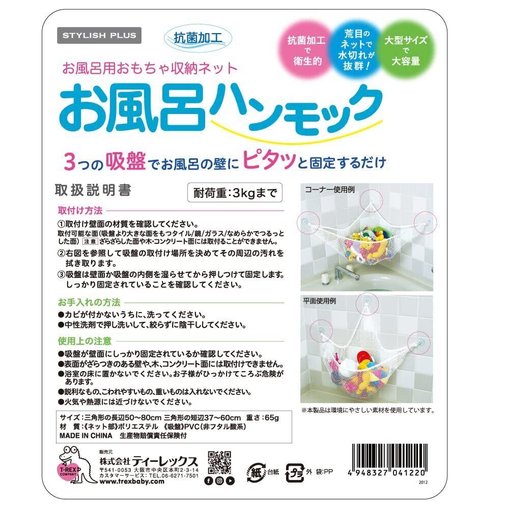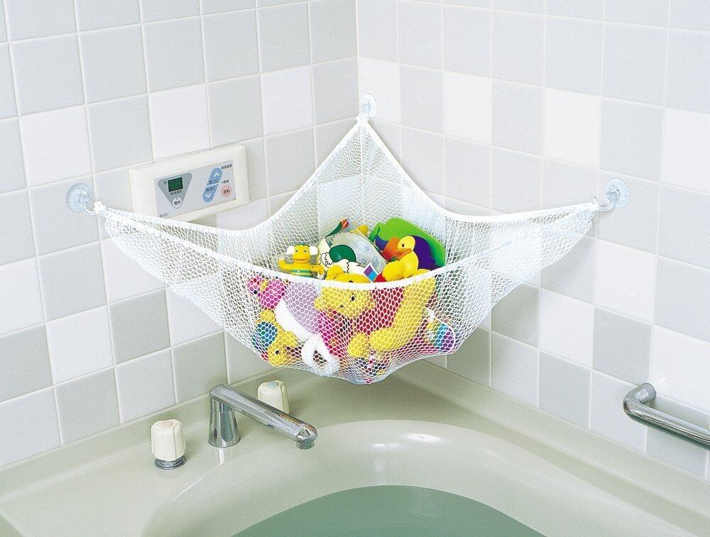 お風呂場で散らかりやすいおもちゃや小物を収納するためのハンモック型のネットです。3個の吸盤で固定するだけの簡単取り付け。吸盤より大きな面をもつタイル、鏡、ガラス、なめらかでつるっとした面に取り付けできます。目が大きいネット素材は抗菌加工済み。水きりが良くてカビにくく、清潔に保管できます。三角形なのでコーナーに取り付けできて省スペース。お風呂場以外でも使用できます。シンプルなホワイトカラーでごちゃごちゃせずスッキリと収納できます。