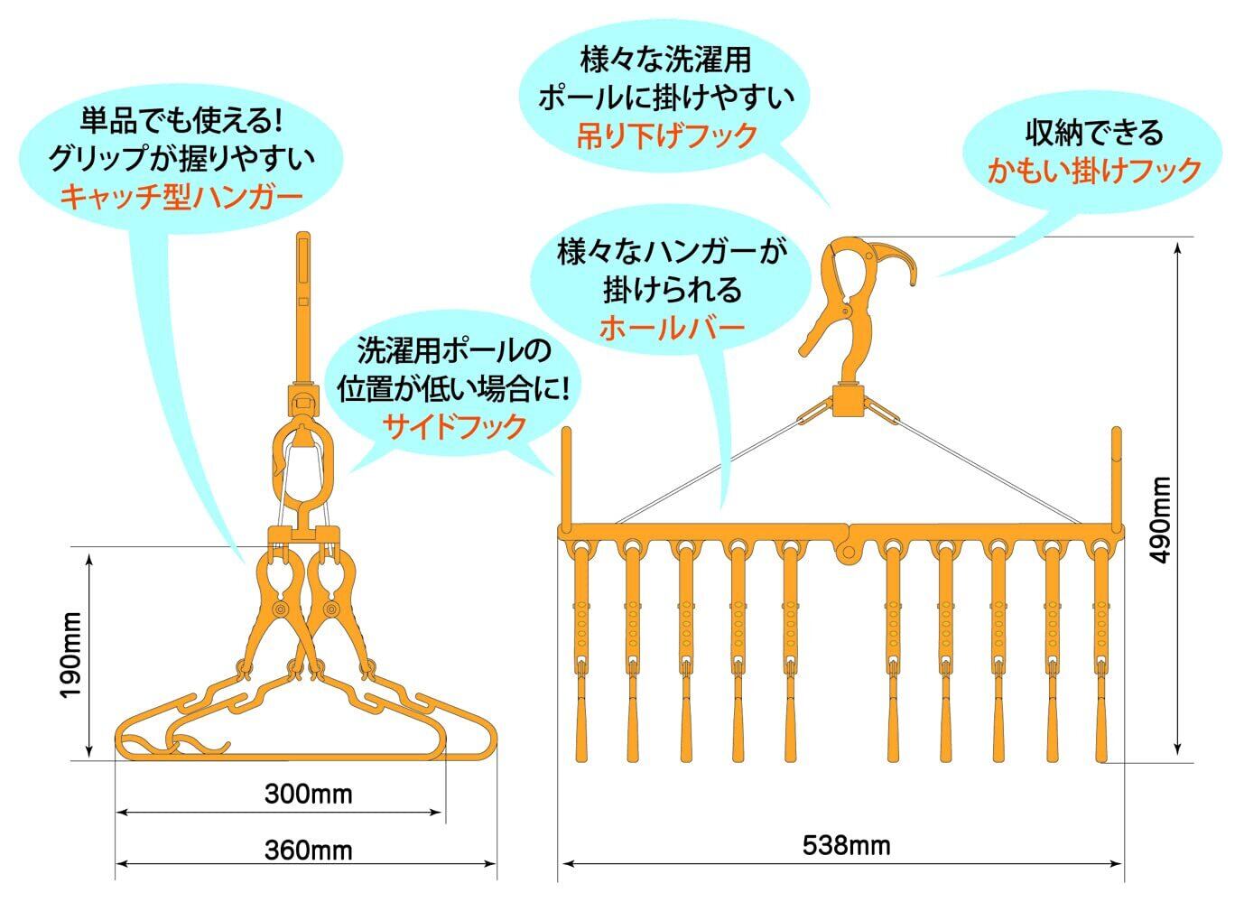 干しやすい!乾きやすい!取り込みやすい!取り外し10連ハンガー。室内干しに便利なフック付き。低い位置でもサイドフックで対応。掛けたまま折りたためて、たがい違いに干せます。(使用方法)1、ホールバーを広げる。2、吊り下げフックを引き上げる。3、吊り下げフックのグリップを握り、バーから外す。4、吊り下げフックを上部に出す。5、吊り下げフックのグリップを握り、洗濯用ポールに掛ける。6、ホール部に洗濯物を掛けたハンガーをバランス良く干してください。