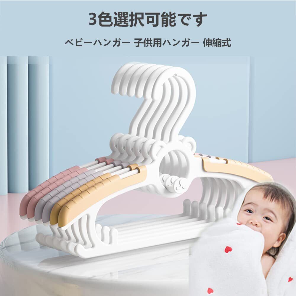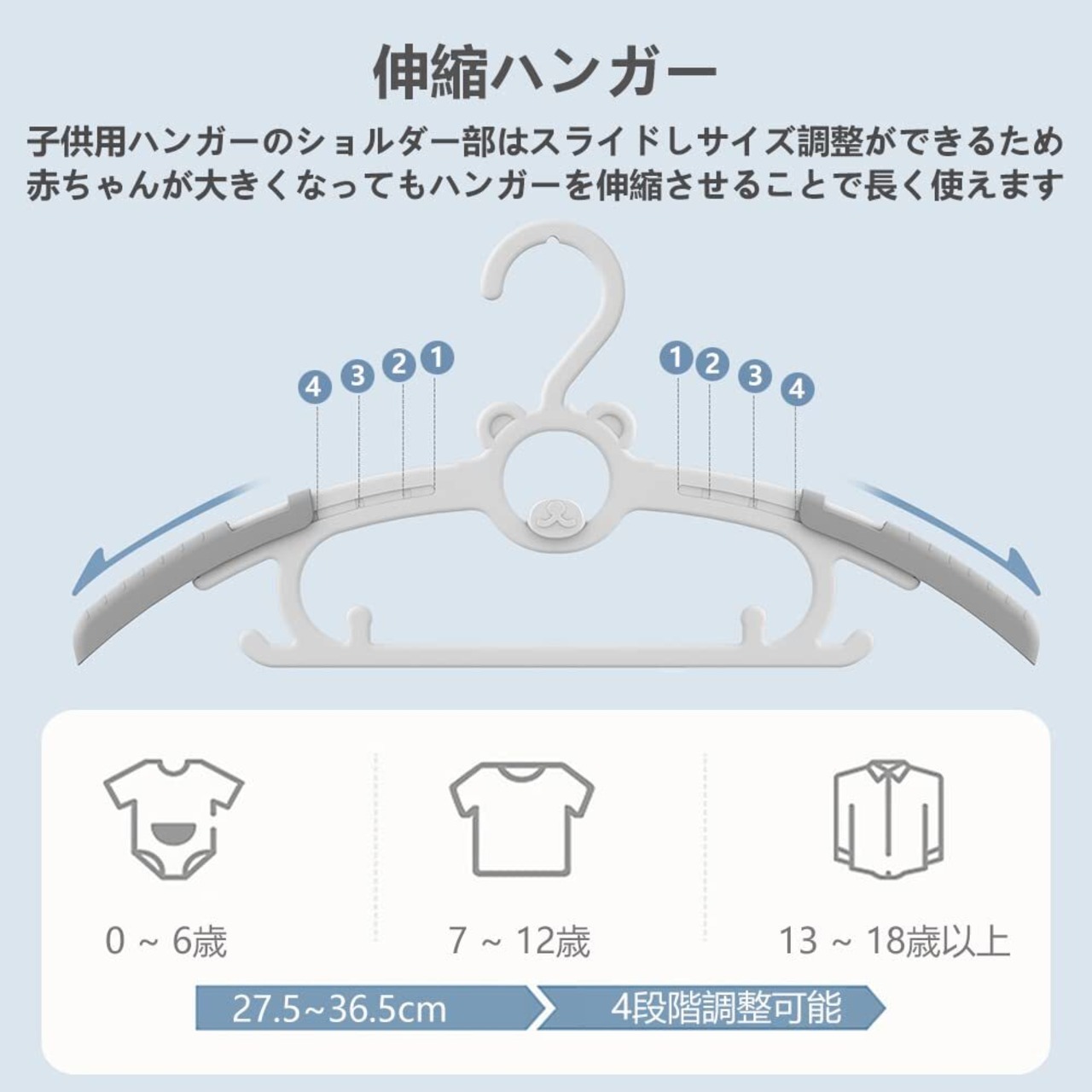 【伸縮ハンガー】 子供用ハンガーのショルダー部はスライドしサイズ調整ができるため、伸縮前の長さは27cm、伸縮後の長さは36.5cmで、4段階調整可能。赤ちゃんが大きくなってもハンガーを伸縮させることで長く使えます。新生児から18歳までの衣類に合わせます。