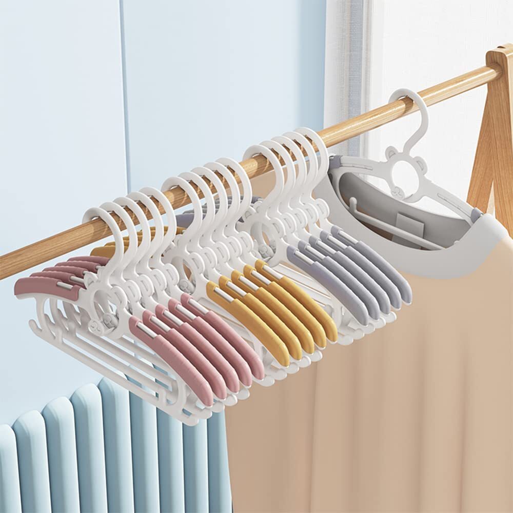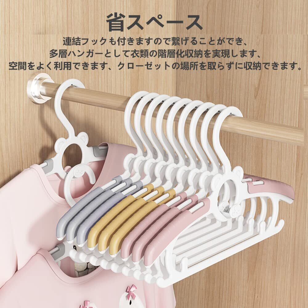 【省スペース】 ベビーハンガーの両端に防風フックを付いて、スカートなどのストラップを固定することができ、使いやすく、収納にとっても便利です。連結フックも付きますので繋げることができ、多層ハンガーとして衣類の階層化収納を実現します、空間をよく利用できます、クローゼットの場所を取らずに収納できます。