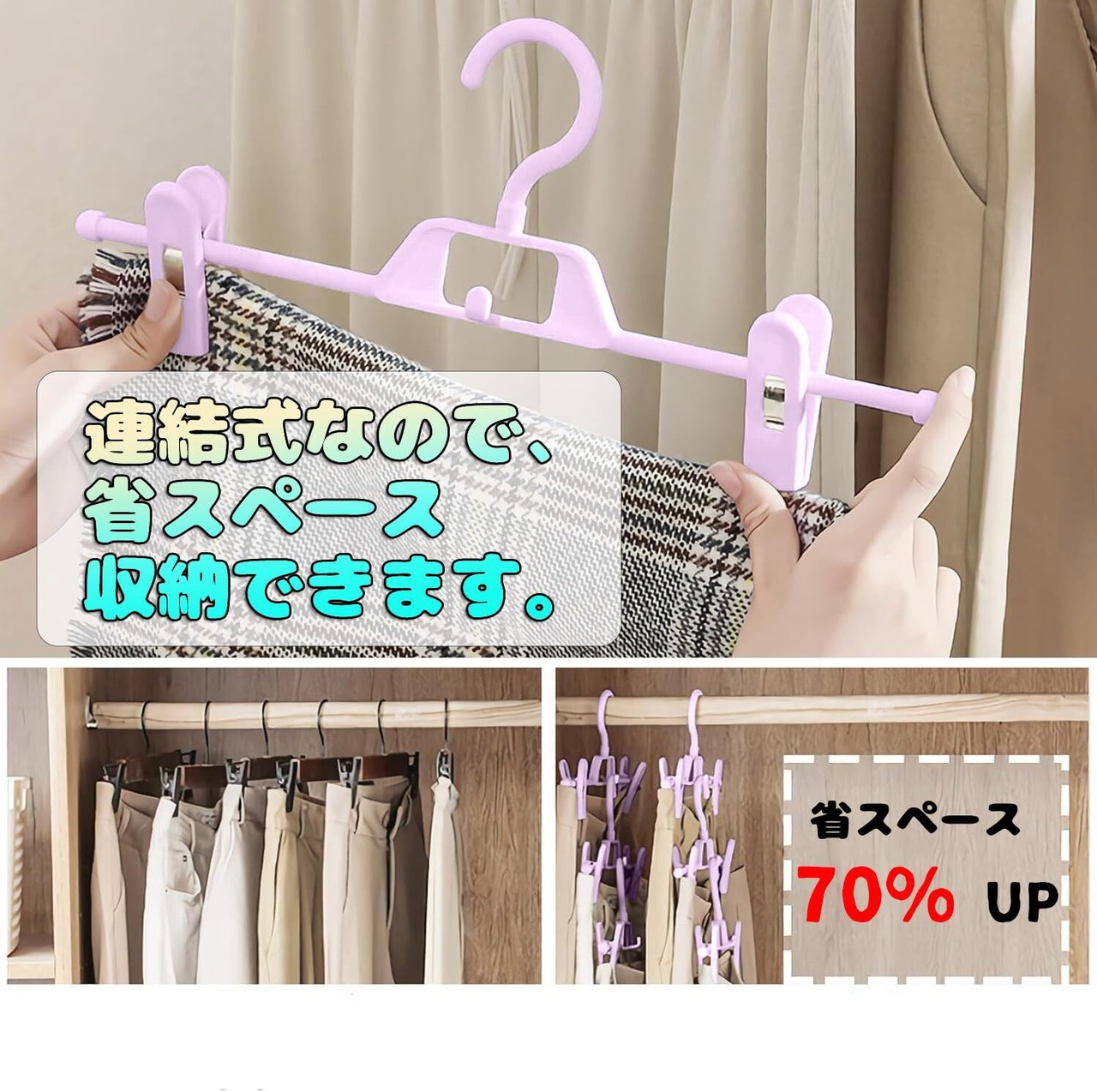 【滑り止め設計】スカートハンガーの先端でノンスリップPVC樹脂で滑り落ちを防止して、衣類をしっかりキ一プ!シワを防ぎアイロン掛けの手間が省けるので、かんたんに衣類をキレイな状態でキ一プ!