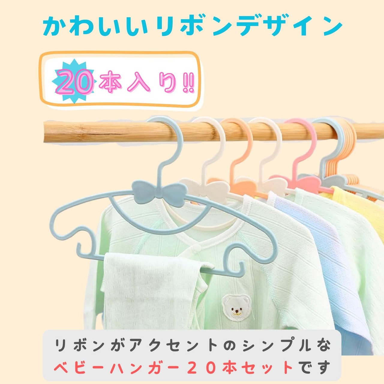 【かわいいリボンデザイン20本セット】かわいい服にはかわいいハンガーを組み合わせましょう!パステルカラーとリボンデザインが可愛らしくお洗濯が楽しくなります。洗濯用やクローゼット用に最適です。【頑丈で柔軟性のあるPP製】高品質なポリプロピレン素材で作られており、柔軟性があり力を入れて曲げても折れにくいたため重い服もしっかりと掛けることができます。
