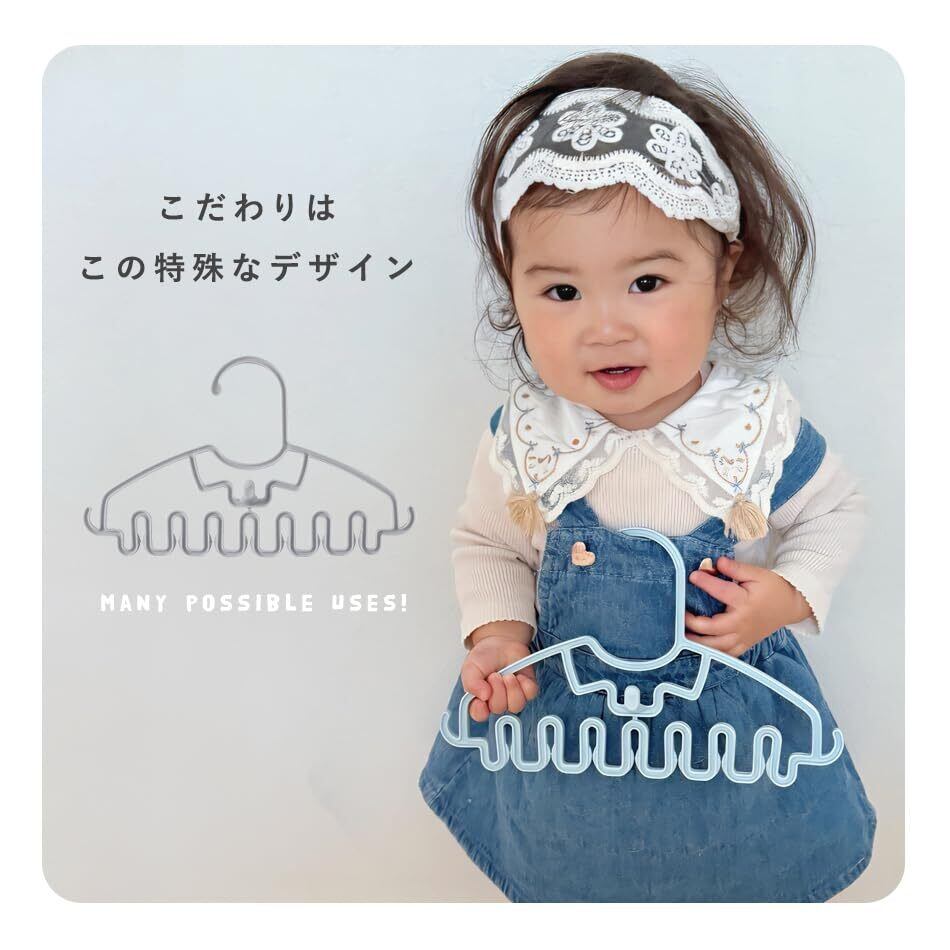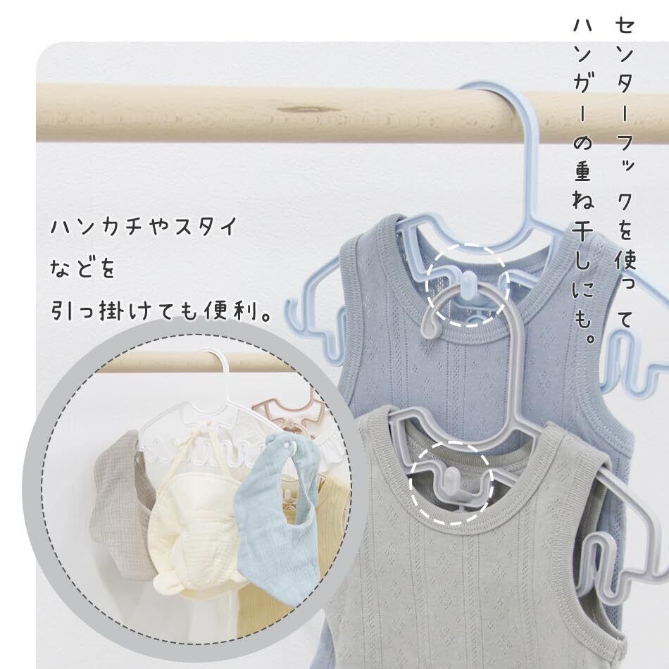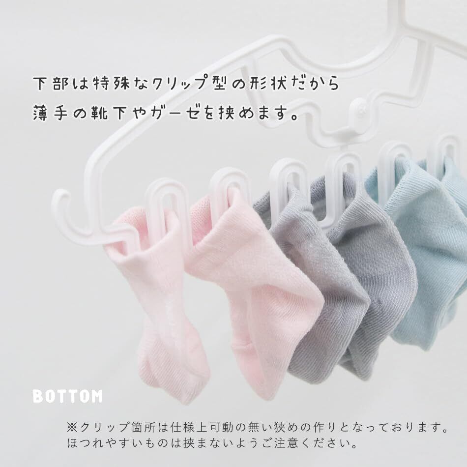 【Point② 特殊なデザインで様々な使い方】・なめらかなカーブで型崩れしにくい設計。サイド&センターのフックはハンカチやスタイなどを引っ掛けられる仕様。センターフックを使ってハンガーの重ね干しも可能です。下部は特殊なクリップ型の形状で、薄手の靴下やガーゼを挟むのに便利です。※クリップ箇所は仕様上可動の無い狭めの作りとなっております。ほつれやすいものは挟まないようご注意ください。