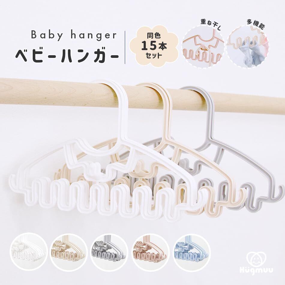 【新着商品】【選べる5色】 ベビーハンガー 15本セット ハンガー キッズ 子ども ベビー服 肌着 収納 洗濯 プラスチック スリムタイプ おしゃれ 可愛い 多機能 軽量 Hugmuu (White)