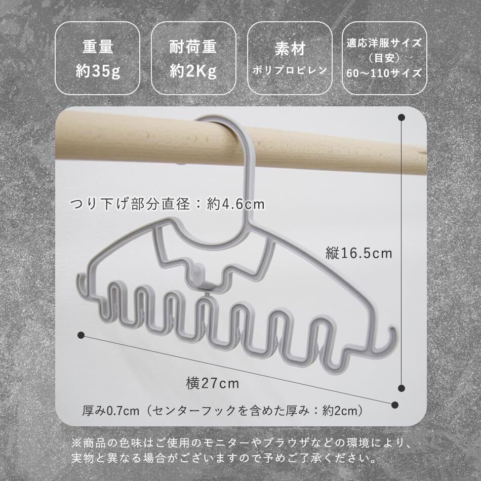 【セット内容】ベビーハンガー 15本(同色)※5本組、3セットの梱包になります。【サイズ】本体:(約)横27×縦16.5×厚み0.7cm、センターフックを含めた厚み:約2cm、つり下げ部分直径:約4.6cm ※実寸は0.5cm前後の誤差が生じます。【適応洋服サイズ】(目安)60~110サイズ【素材】PP(ポリプロピレン)【重量(1本)】約35g【耐荷重】約2kg