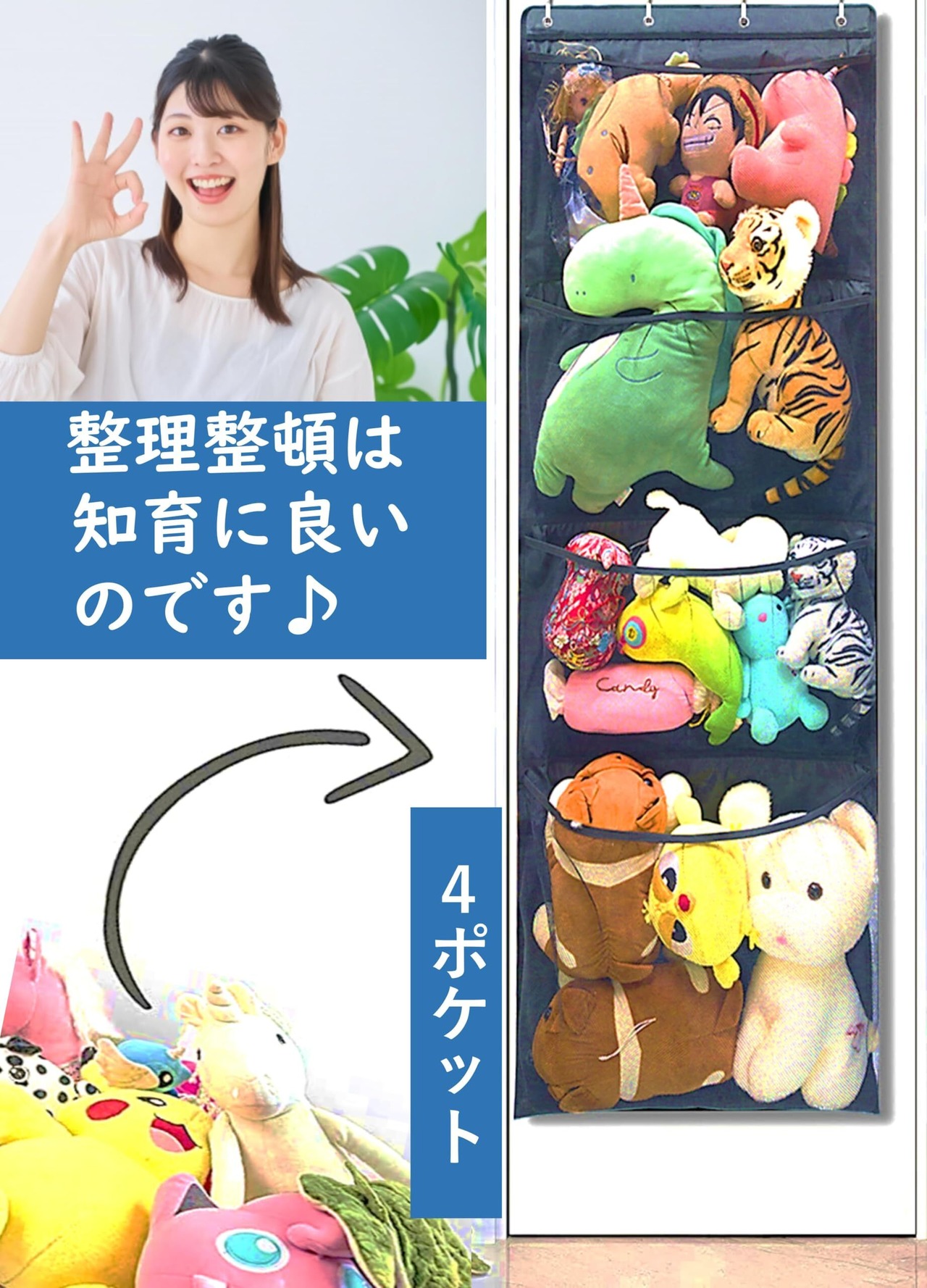 【知育】散乱したおもちゃを部屋に放置する悪習慣から、整理整頓することの習慣を身に着けることで知育にもつながります。ポケットが4つあるので、種類や色、形や大きさなど整理の工夫ができます。