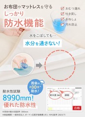 【しっかり防水】裏面のポリウレタンコーティングが水分をしっかりガード!布団を濡らさずに毎朝ストレスフリー。通常のパットでは染み込んでしまっていた水分も防水シーツなら通しません。防水シートを使用すればマットやお布団のストレスから解放されます。