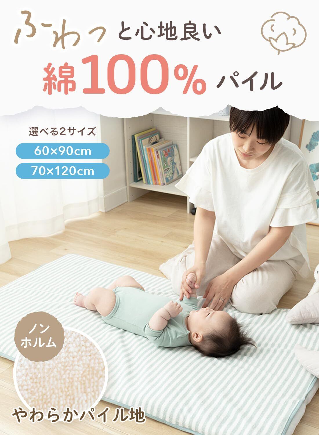 【サイズ】70×120cm【素材】パイル部分:綿100%、基布部分:ポリエステル100%、裏面:ポリウレタンコーティング【品質表示】日本語洗濯表示タグ 洗濯機(洗濯ネット使用)、乾燥機(洗濯ネット使用・乾燥温度上限60℃)【企画・監修】日本【MADE IN CHINA】 ※素材の特性上、パイル部分を強く引っ張ると糸抜けします。※防水シーツ端のテープ巻き縫製部分に水分がかかると縫い目から漏れるおそれがあります。 縫製部分に水分が流れないようご注意ください。※商品仕様は改良のため、生産と在庫状況により記載情報と若干仕様が異なる場合がございます。※閲覧時のモニター環境や光の当たり方などによって、写真と実際の商品の色合いが異なって見える場合がございます。予めご了承ください。