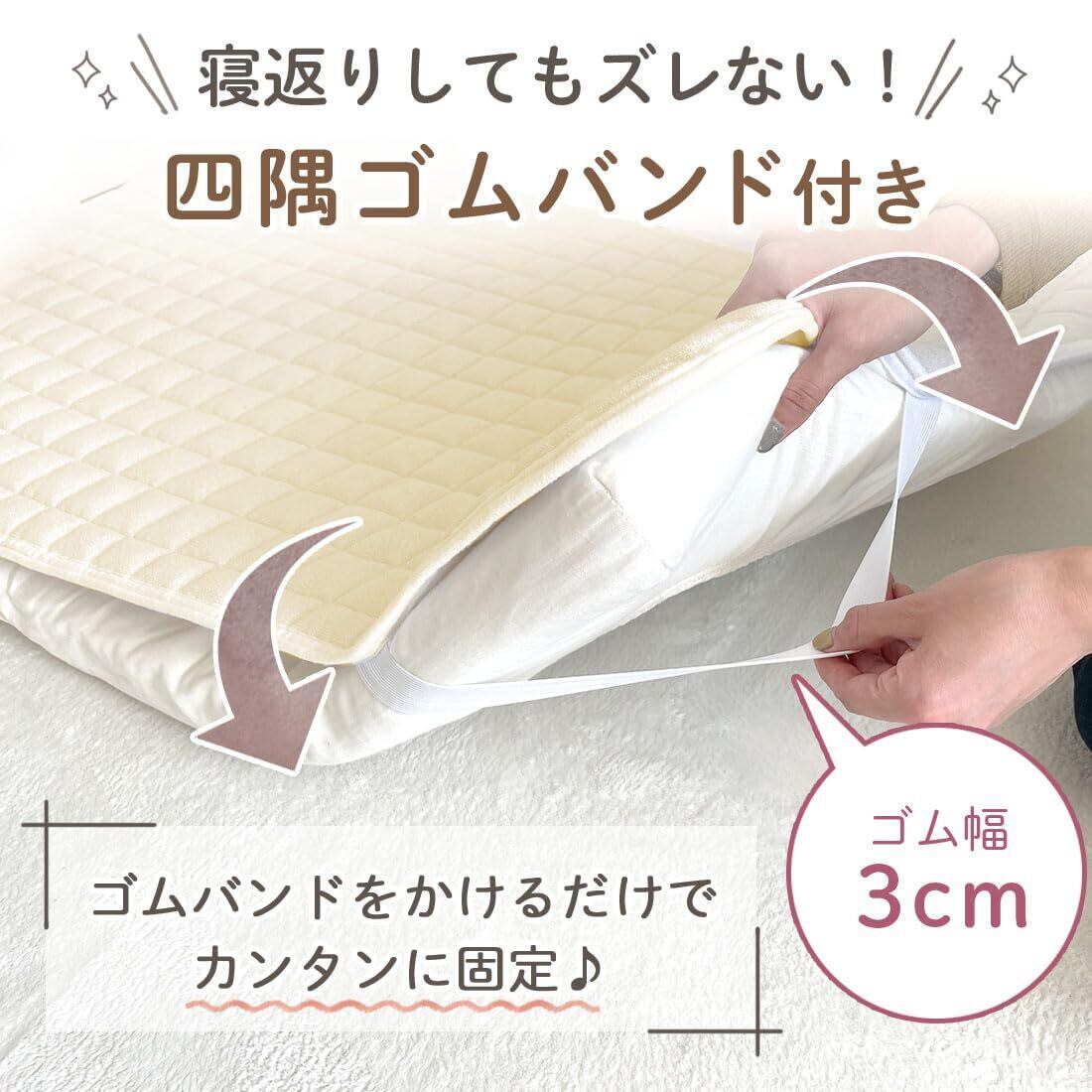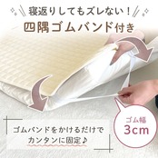 【四隅ゴム付きでずれにくい】四隅のコーナーにはズレ防止のゴムバンドが付いているので寝返りをうっても安心です。洗濯したい時はさっと取れるので忙しい朝もスムーズで楽ちんです。ネットに入れて頂ければ洗濯機/乾燥機での丸洗いOKです。洗濯機でお洗濯の際にはコーティングを長持ちさせるためにも洗濯ネットを使用してください