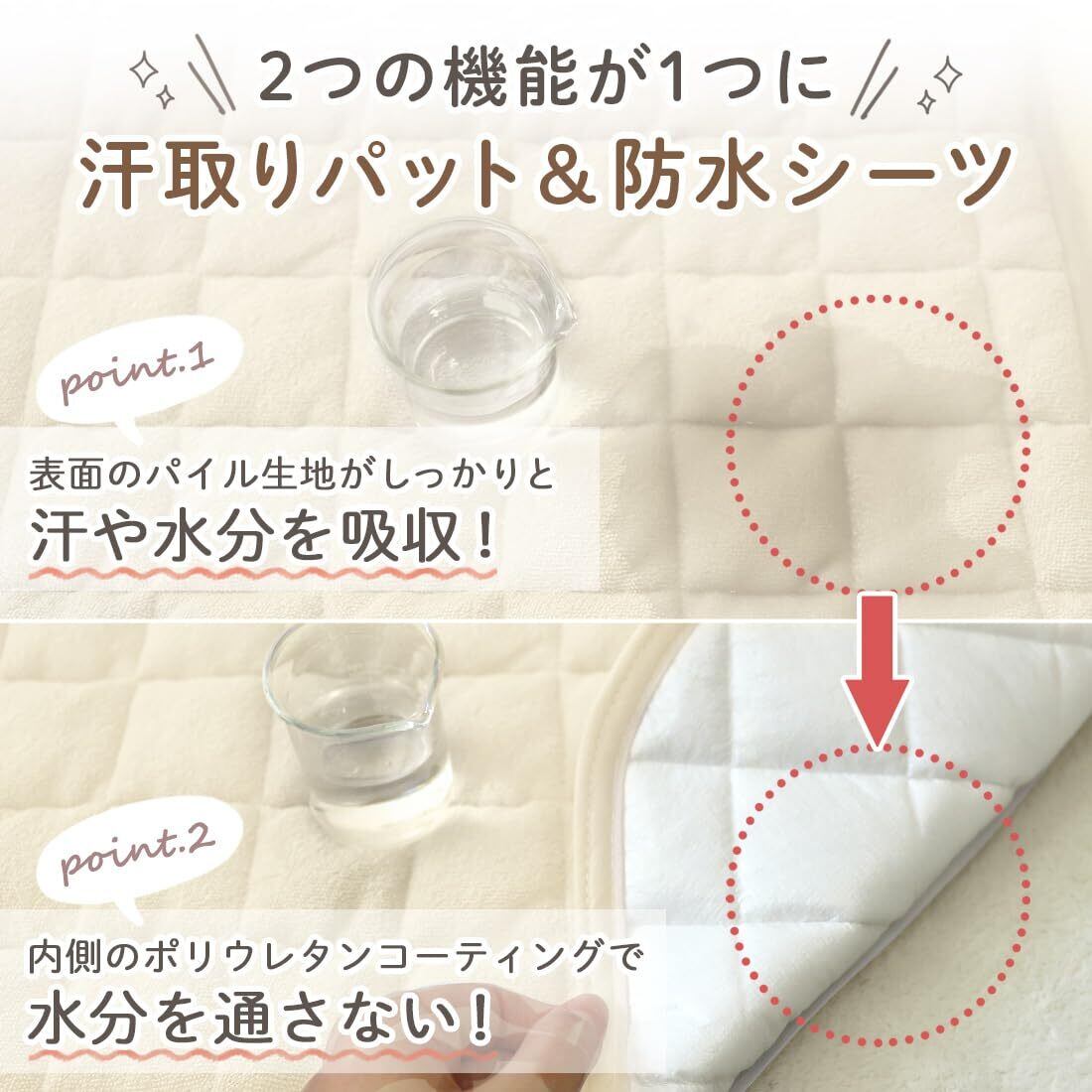 【しっかり防水!でおねしょも安心】裏面のポリウレタンコーティングが水分をしっかりガードします。通常のパットでは染み込んでしまっていた水分も防水敷きパッドなら通しません。耐水性は国内試験所で検査済み。