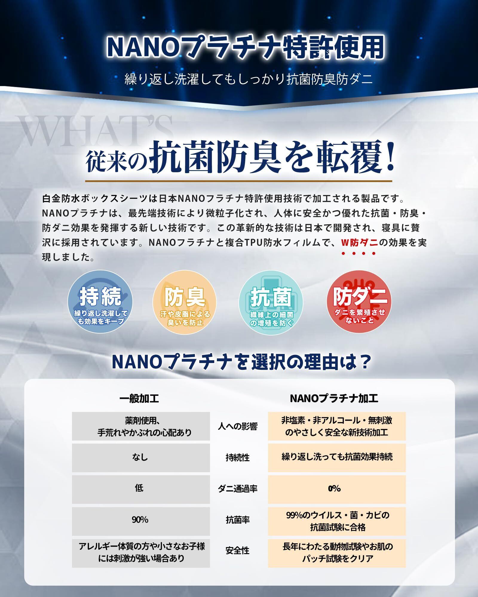 特徴 アレルギー保護, 抗菌防臭, 日本ナノプラチナ使用, 速乾性, 防ダニ性