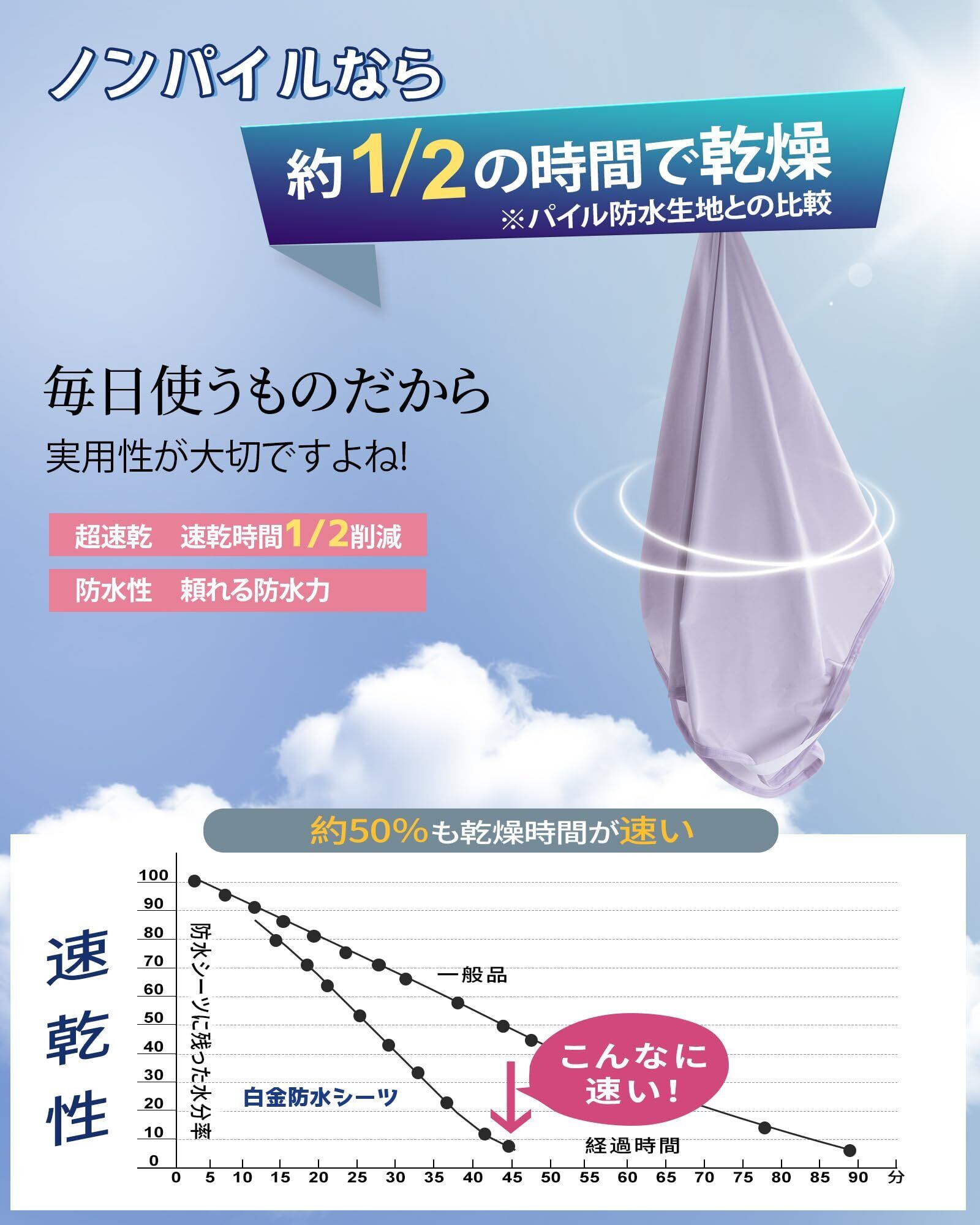 【圧倒的な速乾力・ラクラク時短】介護用防水シーツはコーティングを施した薄いニット生地を使用しています。「朝に洗濯して、お昼になる前にはもう乾いていました。」「曇の日に洗濯しましたが、すぐに乾きました。」という声をいただいております。防水パットは、パイル生地を使用していない分、薄くすることに成功し、ゴワゴワ感を減少することができました。 洗濯後の乾燥時間が短いため、健康的な生活を維持するために定期的なお手入れをおすすめします。