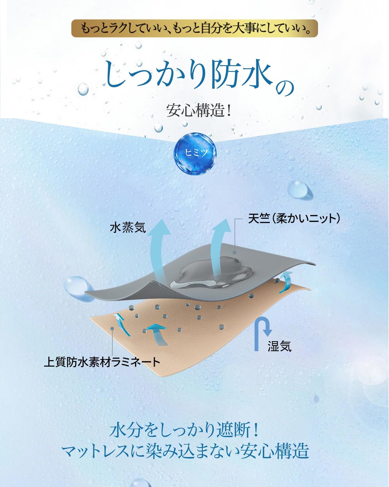 【しっかり防水!浸透させない防水シーツ】防水シーツは防水加工が施され、防水機能に優れたポリウレタン防水膜を使用し、高い防水性を誇ります。おねしょや水などをこぼされても、寝具への水分浸透を防ぎます。高い防水性により、介護用やおねしょ対策はもちろん、寝具への浸水や汚れなどをしっかり防ぎます。おねしょシーツは、お子様との添い寝やベットで一緒に寝られる際時に大変便利です。