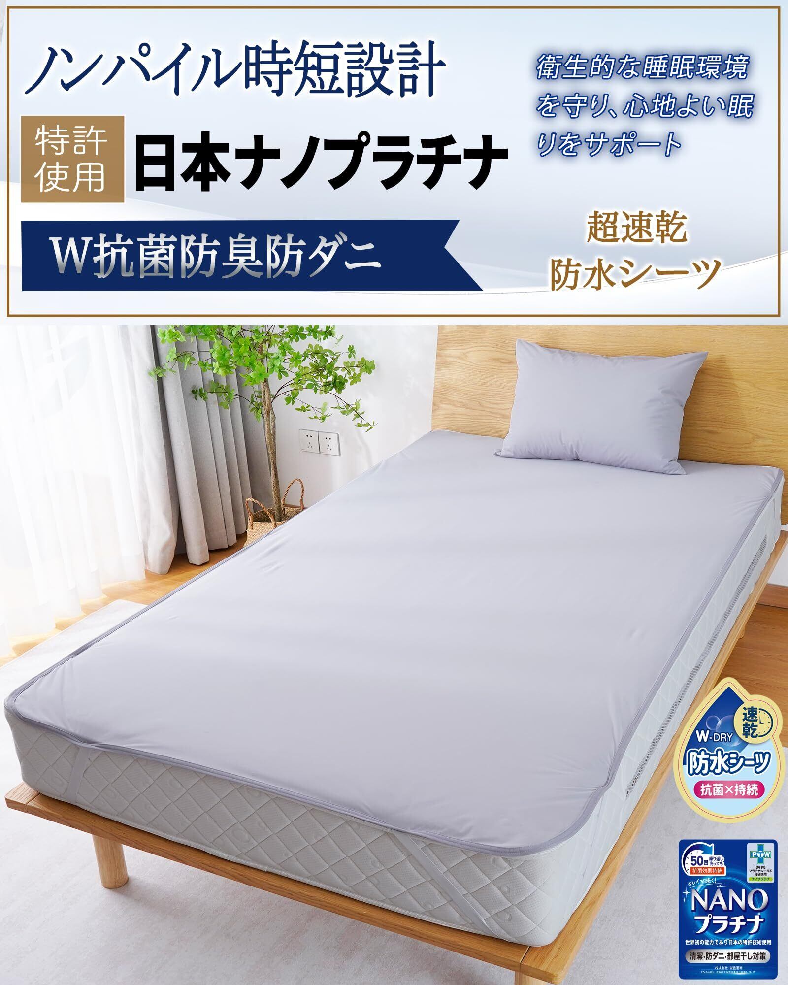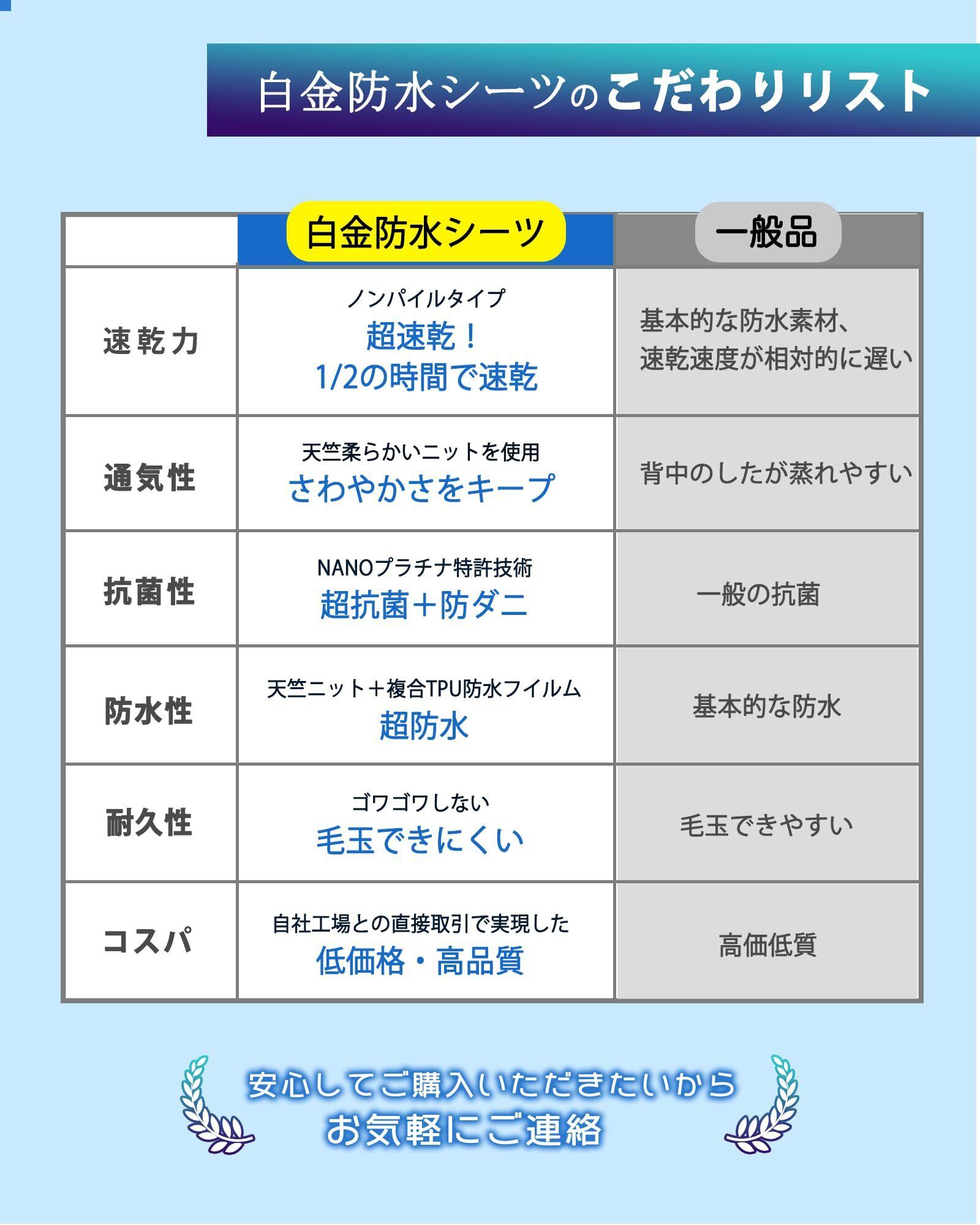 【日本ナノフラチナ使用技術・W抗菌防臭防ダニ】弊店の白金防水シーツは日本ナノフラチナ使用技術で抗菌・防臭・防ダニ機能を最大限に発揮!日本ナノフラチナ使用技術と複合TPU防水フィルム、この2つの技術を基に、ダブル抗菌防臭防ダニ機能を追求し、ダニの侵入防止率高めております。空気中に漂う菌から部屋干し時の濡れたラバーシーツを守ります。しかも、より長時間の清潔効用を持続させ、50回繰り返し洗濯しても機能を持続いたします。介護用防水シーツは湿気の影響を受けやすく、ダニが生息しやすい寝具であるため、ダニ対策を強化した設計で、睡眠中も防ダ二対策を徹底しましょう。
