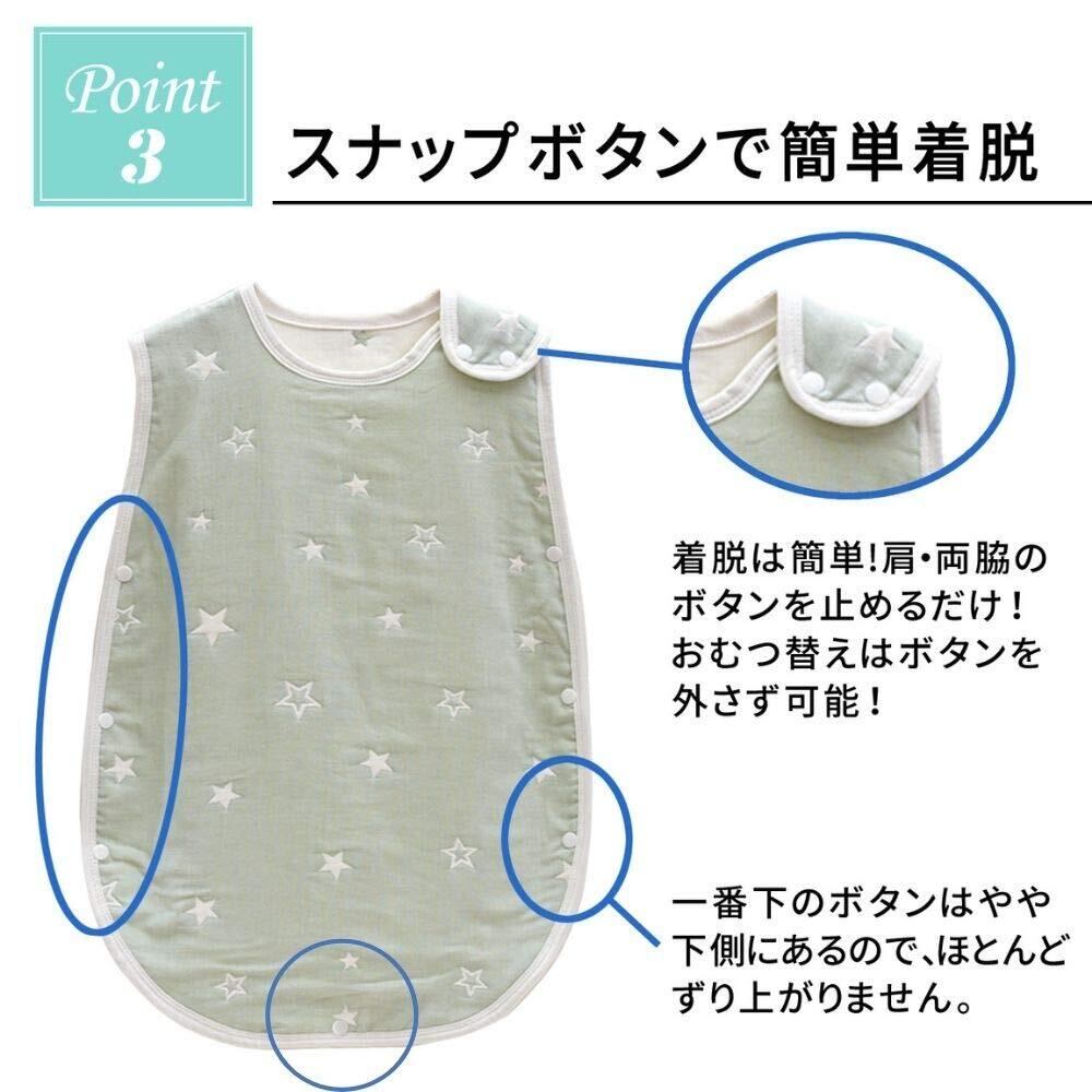 【スナップボタン️】マジックテープは赤ちゃんの肌を傷つける可能性があるため、着脱にはスナップボタンを採用しました。新生児の赤ちゃんには、スリーパーを床に引いた上に赤ちゃんを寝かせて簡単に着用。立てるようなっても上から被せて左右のボタンを止めるだけなので、着脱は簡単!パパママのストレスを減らします。※2020年10月から全カラーに股下のスナップボタンがつくように仕様変更しました!動きが大きいお子様も安心してご利用いただけます。