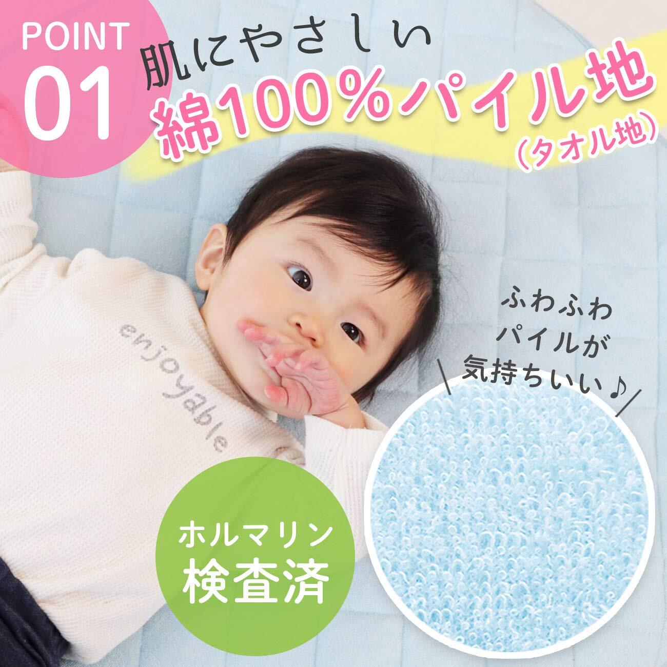 【肌に優しいコットン100%】コットカバーの表生地は、肌に優しいコットン100%。子どもが直接触れる生地なので、ふわふわ気持ちいいパイル地を採用しています。