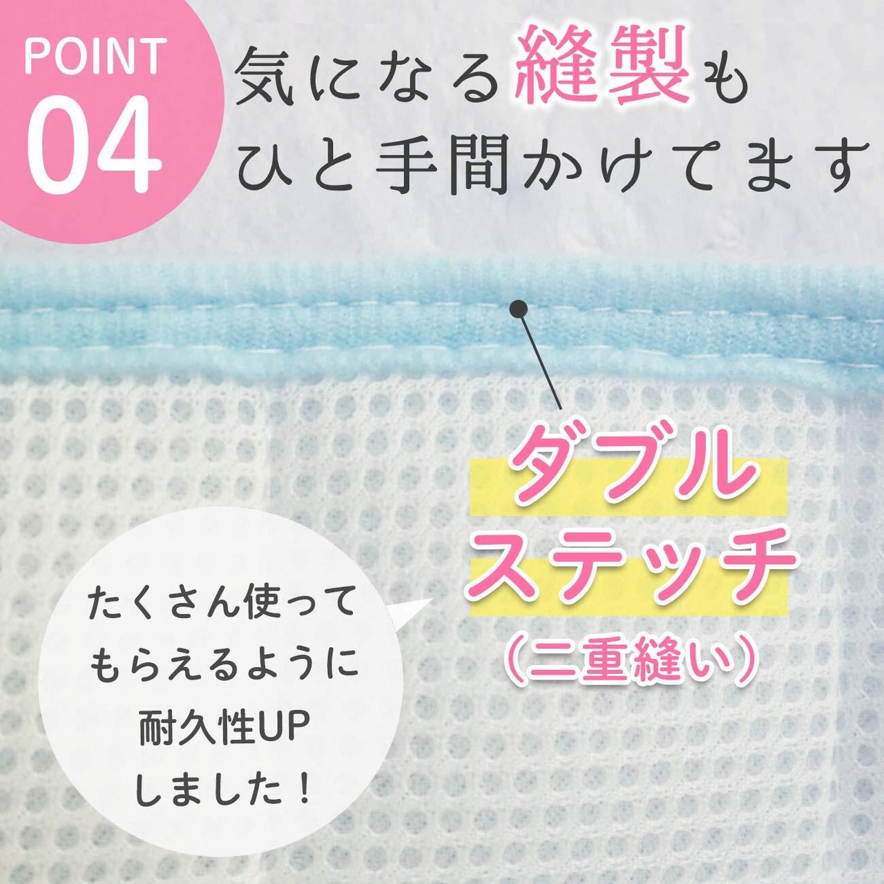 【縫製もひと手間】コットカバーのパイピング(周りの淵)部分は、2重縫いをしています。さらにゴムを縫い付けいている部分も2重で縫っているので、より丈夫に。たくさん使ってもらえるように強度にもこだわりました。