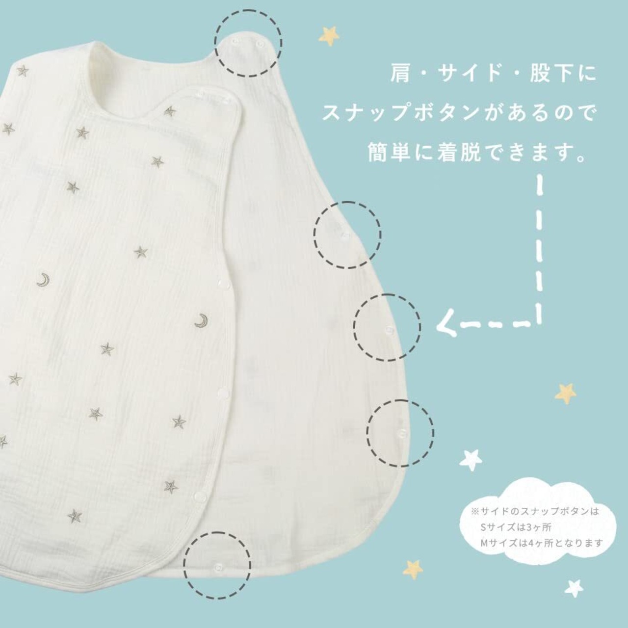 【お子様が過ごしやすい仕様】股下にスナップボタンがあるので、たくさん遊んでもずれません。またおむつ替えのときに便利です。肩とサイドにスナップボタンがあるので、簡単に着脱できます。全体的に軽くゆったりとしたサイズ感で、体に負荷がかかりません。通気性があり肌触りの優しい柔らかいガーゼを使用し、赤ちゃんのデリケートな肌を守ります。スナップボタンはSサイズは3ヶ所、Mサイズは4ヶ所となります。