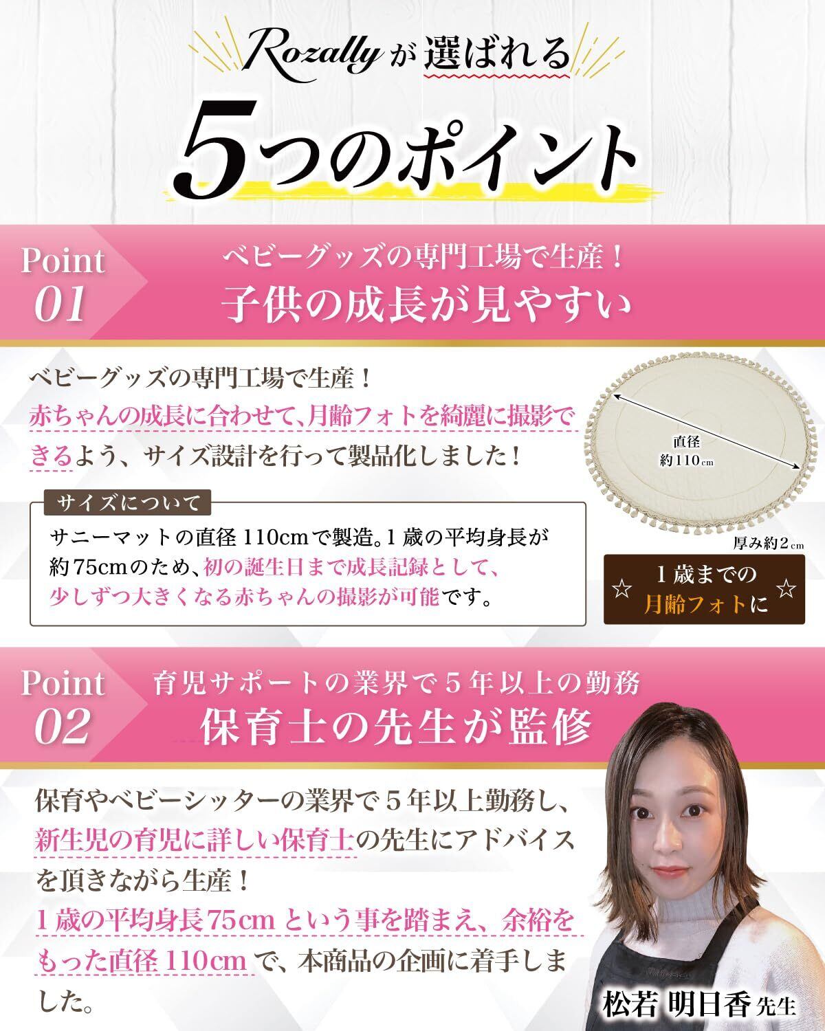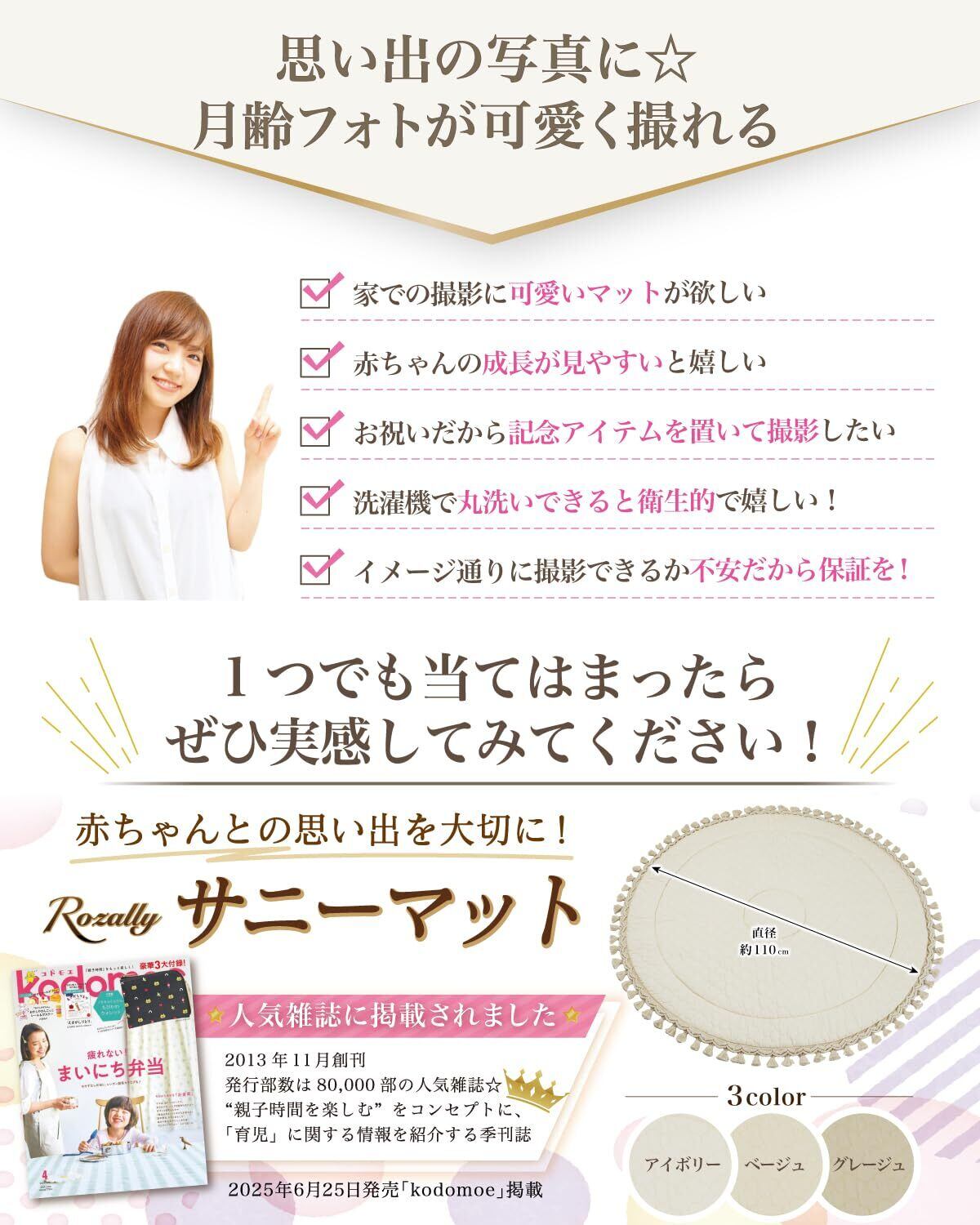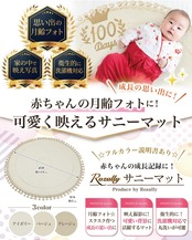 【保育士が監修】 Rozally サニーマット がついに正式販売開始。 「月齢フォトの映える背景に…」「ベビーマットとしてお昼寝に使いたい…」という お客様の声から生まれた 「記念撮影で大活躍」 の 洗える サニーマットです。 リビングに敷いて お昼寝マット や プレイマットとして使用できるのも人気の1つです。 「お七夜」「お宮参り」「初節句」「百日祝い」「お食い初め」「初誕生日」などの、 赤ちゃんの成長記録として記念写真に大人気のイブルマットとなっています。 「ごろ寝」している可愛い寝相を今話題のごろ寝アートとして、 記念写真に残しておくのも大切な思い出になります。 企画&設計では 新生児 や 乳幼児 など 赤ちゃん の育児に詳しい【保育士】の先生からアドバイスをもらい、衛生的に使えるよう丸洗い可能な素材選定を行いました。 シンプルで可愛いデザインに仕上げたため出産準備や出産祝いなどギフトにも最適になっています。