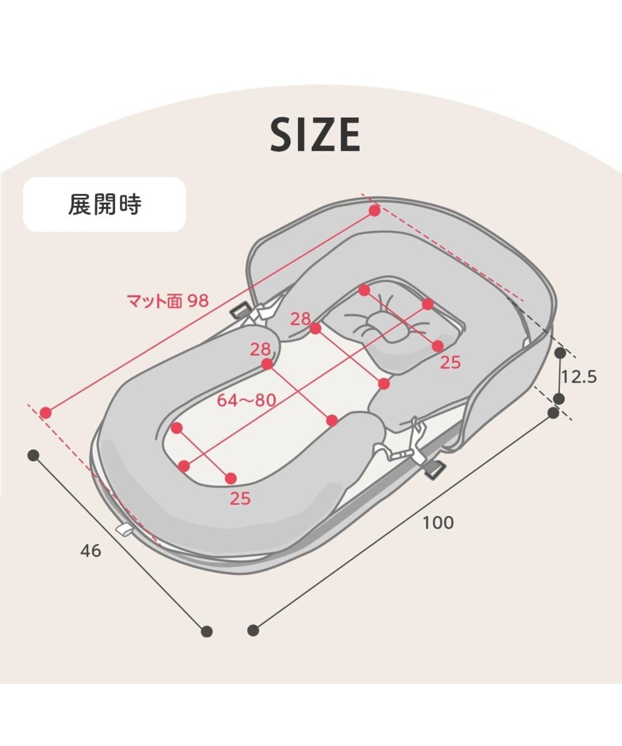 上下のクッションは赤ちゃんの成長に合わせて伸縮可能で、新生児から6ヶ月頃まで対応します。