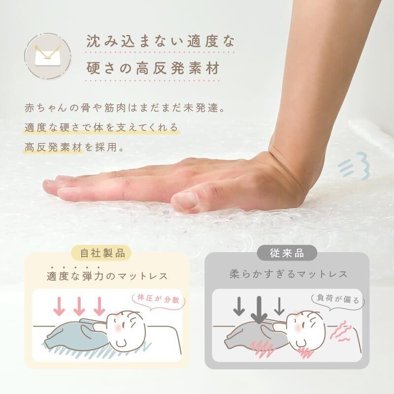 【厚みと硬さがあることでちゃんと支える】赤ちゃんにとってやわらかすぎる布団は、沈み込みやすく、姿勢が崩れやすい原因にも。骨や筋肉がまだ未発達な時期だからこそ、ほどよい硬さで体をしっかり支えることが大切です。テコペコのベビーマットレスは、赤ちゃんの体を沈ませすぎないしっかりめの厚みで設計されています。寝返りがしやすく、赤ちゃん自身の動きも妨げません。赤ちゃんが気持ちよさそうに過ごしてくれる、そんな「ちょうどよさ」にこだわりました。