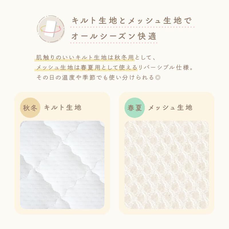【スペック】▶サイズご自宅での使用はもちろん、保育園用としても使いやすい2サイズ展開です。レギュラーサイズ:120×70cm(ベビーベッドにぴったり)ミニサイズ:90×60cm(省スペース・お昼寝マットとしても◎)▶素材・カバー表面(キルティング側):綿100%(ニット生地)・カバー裏面(メッシュ側):ポリエステル100%(通気性の良いメッシュ)・中材:ポリエステル樹脂(立体構造ファイバー)▶お手入れ方法・カバー:取り外して洗濯機OK(ネット使用推奨)・中材:水洗いOK(シャワーなどで流すのがおすすめ)▶付属品・持ち運びに便利な専用収納バッグ付き