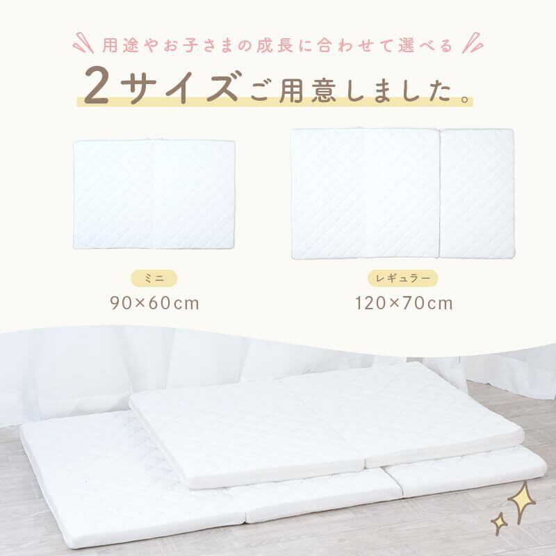 【2サイズ展開で使い方にフィット】赤ちゃんの成長やご家庭のライフスタイルに合わせて選べる、うれしい2サイズ展開。《ミニサイズ(60×90cm)》は、保育園のお昼寝布団と同じサイズ。コンパクトで省スペース、持ち運び用のバッグ付きなので、おでかけや帰省時にも便利です。《レギュラーサイズ(70×120cm)》は、ベビーベッドにぴったりフィットする定番サイズ。おうちでのねんねにぴったりです。サイズに迷ったら、使用シーンに合わせて選ぶのがおすすめです。