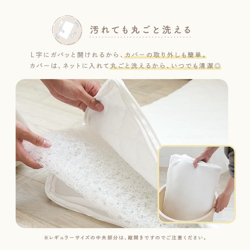 【通気性のヒミツは「立体ファイバー」】赤ちゃんが一日中過ごす場所だから、ムレにくく、呼吸のしやすい環境を整えてあげたい。テコペコのベビー敷布団は、中材に空気の通り道がたっぷりある「立体ファイバー」を使用。うつ伏せ寝でも呼吸を妨げにくく、汗をかいても湿気がこもりにくいため、赤ちゃんにとって快適な状態を保ちやすい設計です。外側のカバーも、ふんわりやわらかなニット生地と通気性の良いメッシュ素材を使っており、季節を問わず心地よく使えます。もちろん、カバーは取り外して洗濯OK。中材も水洗いできるので、いつでもきれいに保てます。