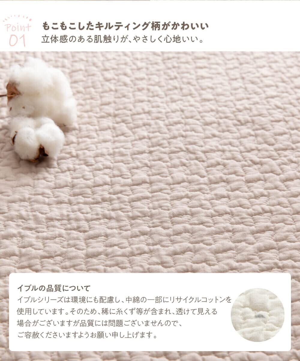 mofua(モフア) イブル クラウド柄 綿100% フィットシーツの特長 ポコポコしたくもの形のキルティングがかわいい綿100%のフィットシーツで毎日さらっと快適な眠りを。 オールシーズン快適、綿100% 高い吸湿・吸水性で汗ばむ季節はベトつかず、さらっと快適、寒い季節はほんのりあったかで、オールシーズン快適な眠りをもたらしてくれる綿100%のフィットシーツ(ベビー布団カバー)です。 洗えるからいつも清潔に 寝汗やミルクの吐き戻しなどで汚れやすいベビー布団を汚れやキズから守ります。おうちの洗濯機で丸洗いできるのでいつも清潔にお使いいただけます。 ※フィットシーツのお洗濯は洗濯ネットに入れてください(日陰での裏干しをおすすめします) ※キルティング製品の性質上、縮みやすいので、お洗濯後はよく形を整えてから干してください。 全周ゴム仕様でずれにくい ナイスデイ mofua イブル CLOUD柄 フィットシーツはぐるっと1周フィットゴムが付いているので、寝ている間に動いてもずれにくく、ベビー布団にしっかりセットできます。お洗濯の際はさっと外せて取り付けも簡単。頻繁に洗いたいベビー寝具にはうれしい仕様です。 ベビーにもかわいいニュアンスカラー6色から選べます 無地でも存在感のあるポコポコかわいいフィットシーツ(ベビー布団カバー)は主張しすぎず、寝室にもしっくり馴染みやすい6色のバリエーション。リビングに置いても布団っぽくならず、どんなインテリアにも溶け込みます。 かわいいリボン付き mofuaのロゴ入りリボンで結わえたかわいいパッケージでお届けします。お祝いやプレゼントにしても喜ばれます。 安心の低ホルムアルデヒド製品 ナイスデイ mofua(モフア) イブル クラウド柄 綿100% フィットシーツは厚生労働省が定める乳幼児基準をクリアした低ホルムアルデヒド製品です。赤ちゃんや小さなお子様にも安心してご利用いただけます。 安心してお求めいただける「1年間の品質保証付き」 【ナイスデイ mofua(モフア) イブル クラウド柄 綿100% フィットシーツ】は、安心してお求めいただけるように1年間の品質保証をお付けしています。万が一、不良があった場合、弊社保証規定に基づき保証対象となりますのでお気軽にお問い合わせください。※誤って類似品・模造品をご購入されますと、保証対象外となりますのでご注意ください。 株式会社ナイスデイについて 当社は創業125年を誇る日本毛織株式会社(東証1部上場・通称ニッケ)のグループ企業です。みなさまに「心地よい『おやすみ』を創りお届けする」ことを企業理念とし、皆様から頂戴する貴重なご意見に耳を傾け、日々品質の向上に取り組んでおります。商品についてのご質問、ご相談、ご不明点等がございましたら何なりとお申しつけください。