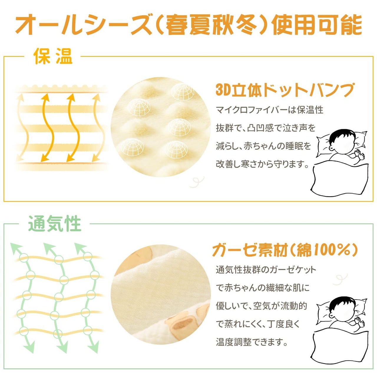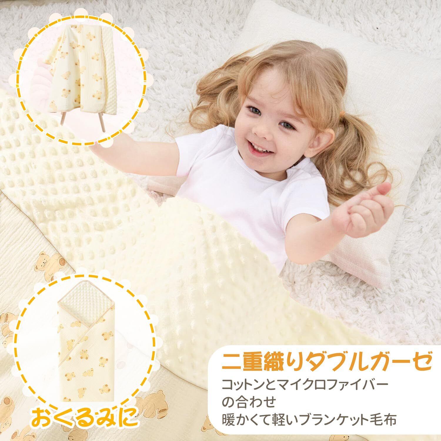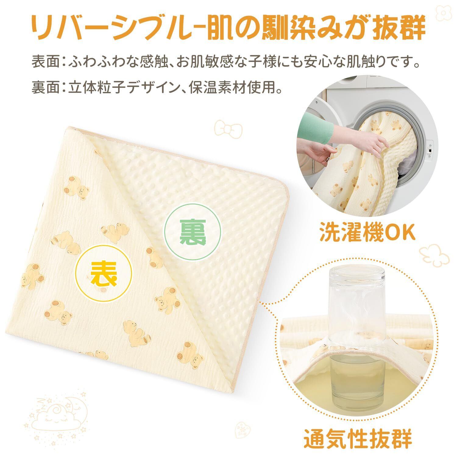 【3Dドットバンプ】赤ちゃんの繊細な肌に守り、優しく包まれたような丸い接触への物理的なホットプレスプロセス仕様です。赤ちゃんから子供、大人まで使用範囲が広く、リバーシブル仕様で一面はダブルガーゼ使用し、一面は凸凹付きのマイクロファイバーを使用しています。快適さとソフトの触感を体験できます。夏場はしっかりと汗を吸収し、冬場は暖かさを逃さず、一年を通じて使えます。