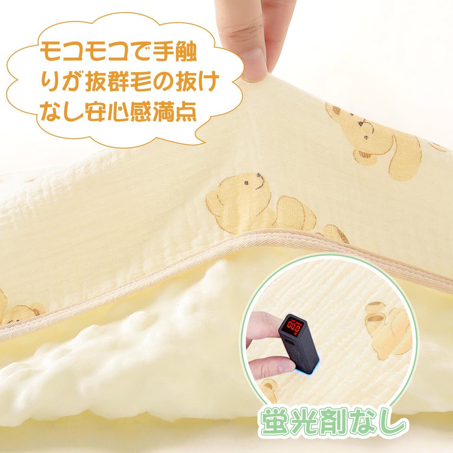 【ダブルガーゼ使用】ダブルガーゼ使用を使用し、高密度な織り方で毛抜けなく、耐久性が高くなります。ガーゼ特有の通気性と柔らかさが満点です。吸湿性が強い速乾性も強い、滑らかな手触りです。コットン製で基本的に肌あたりが優しいガーゼケットですが、赤ちゃんのデリケートなお肌の人にコットンで作られたガーゼケットがおすすめ。