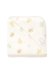 ベアやゾウ、キリンなど、カラフルなぬいぐるみがふわっと飛んでいるような、親子で楽しめるプリント柄シリーズです。オフホワイトの柔らかなカットソーを使用したBABYサイズのブランケット。フード付きなので、おうちでのお昼寝や外出先でのおくるみまで幅広いシーンに便利です。同シリーズのワンポイントロンTと同じロゴ刺繍が入ったキャッチーなデザインです。同柄のウェアや小物、ニット製のぬいぐるみ雑貨を組み合わせてギフトにもおすすめです。ママやKIDSアイテムとのリンクコーディネートもお楽しみください。