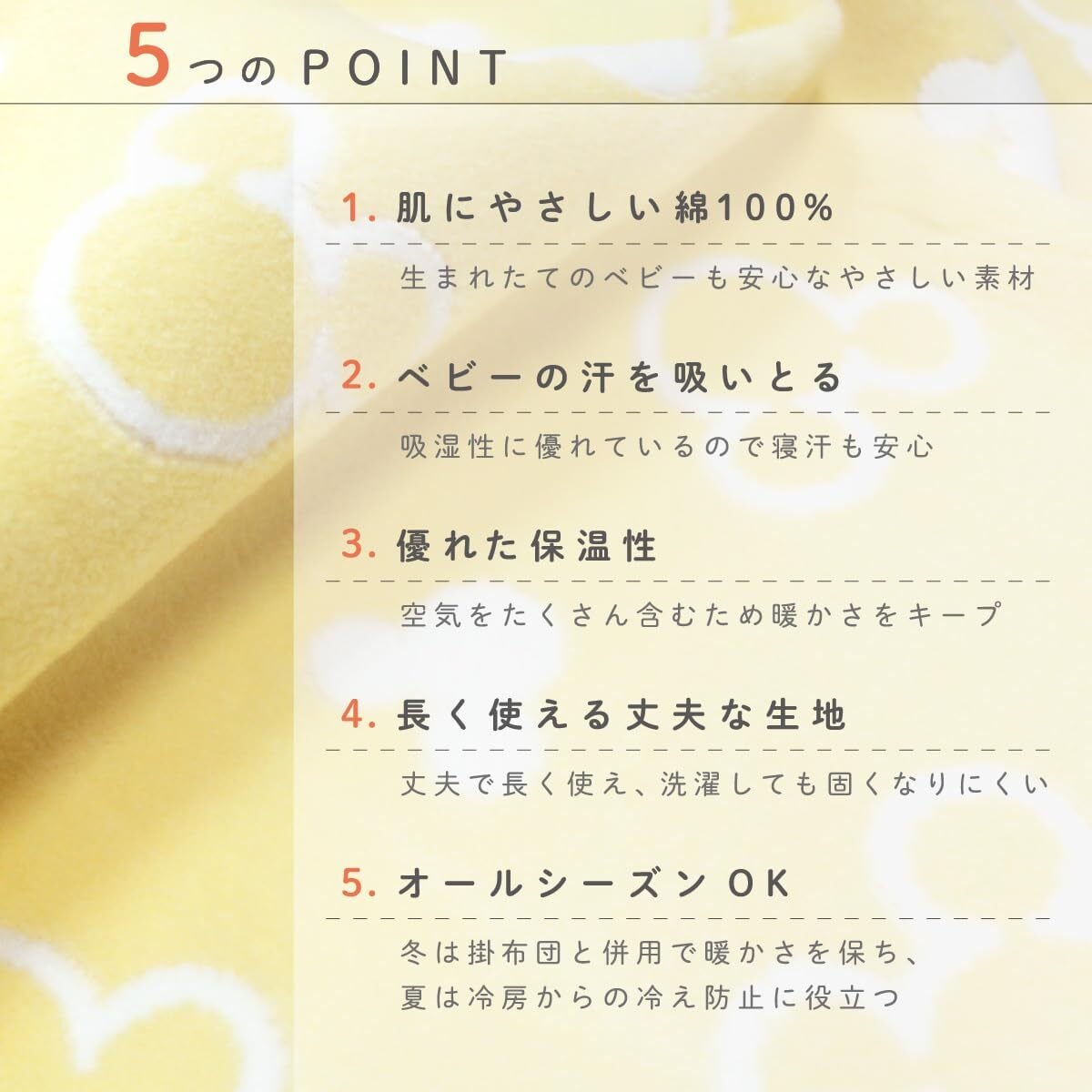 生まれたてのあかちゃんの肌にも優しい綿100%。吸湿性に優れているので、あかちゃんの汗を吸い取ってくれます。空気をたくさん含んでいるので、保温性にも優れています!