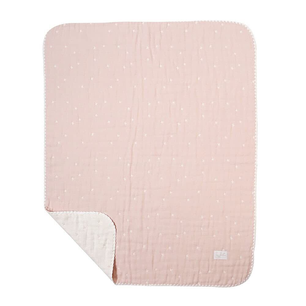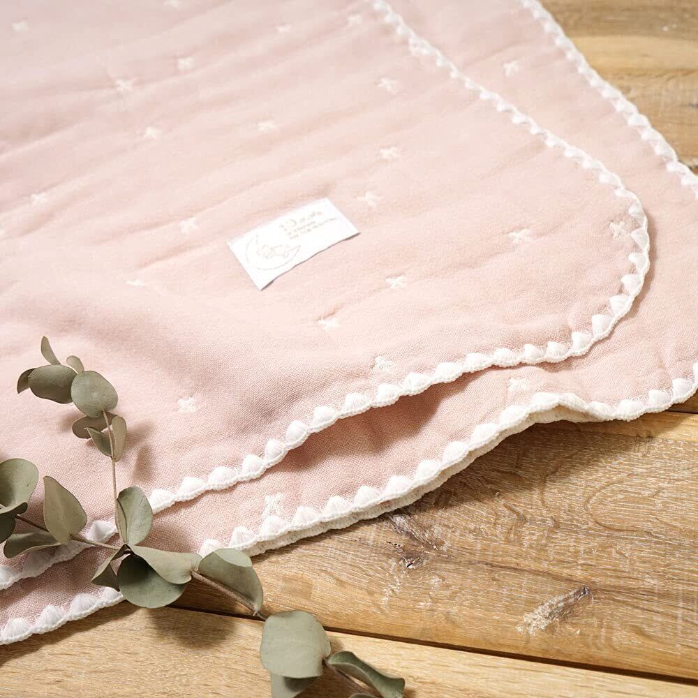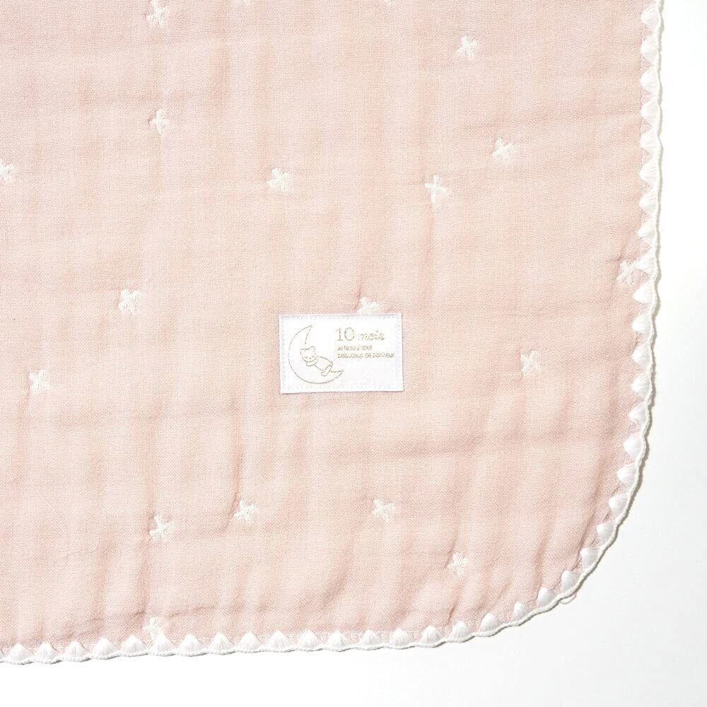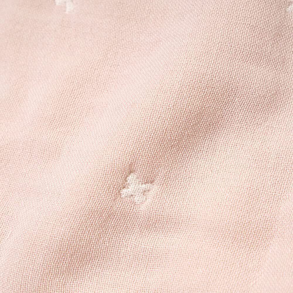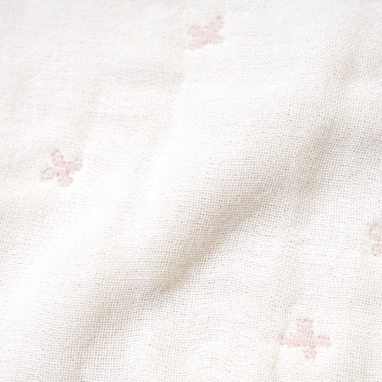 コットン100%。柔らかく、ふっくらふくふくの国産6重ガーゼケット。6重に重ねたガーゼは、空気の層を作り温度を保つことができるため、冬でも暖かです。通気性、速乾性が高いので汗を吸ってもすぐ乾き蒸れません。【ふくふくガーゼ】吸水性と保温性を兼ね備え、1年中ずっと使えます。表面は細い糸、真ん中に進むにつれて太い糸を使用して織ることで、ボリューム感を出し、洗えば洗うほどふっくら感が増すのが生地の特徴。昔から織物が盛んな愛知県三河地方の高い技術力とこだわりを結集して作りました。2018年に「おもてなしセレクション」を受賞した「ふくふくガーゼ」は、ご自宅用にもギフトにもおすすめです。散りばめられたクロス柄は、天使のようであり、鳥や星の瞬きのよう。“いつもあなたのそばに"赤ちゃんの笑顔に引き寄せられ、赤ちゃんの周りには、自然と幸せがあふれています。そんな、赤ちゃんの誕生を祝福するテキスタイルです。やさしい色合いのシェルピンクと、甘すぎず、インテリアにも馴染みやすいパウダーブルーの2色展開です。周囲にハマグリ刺繍を施し、赤ちゃんらしい柔らかい雰囲気のデザインにしました。
