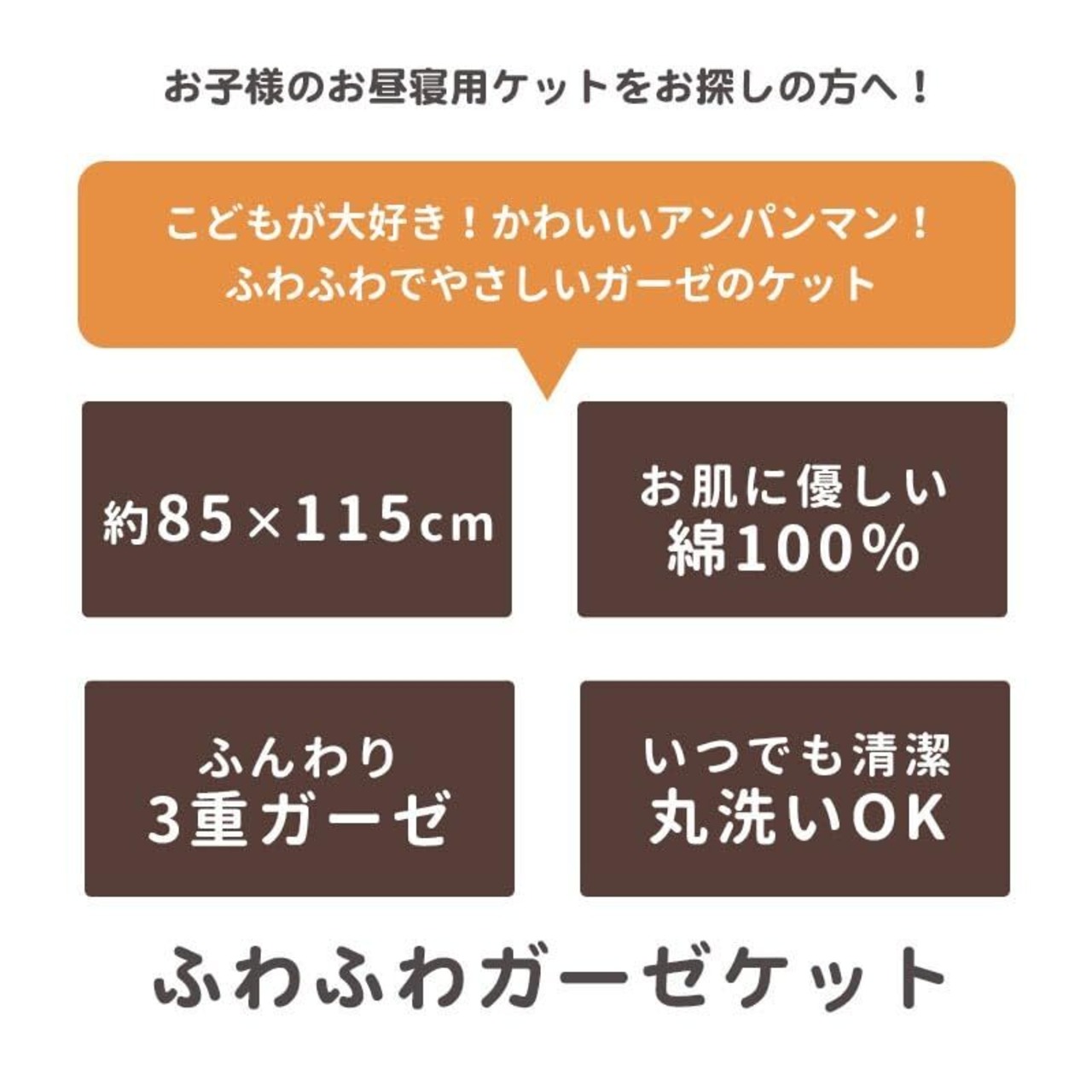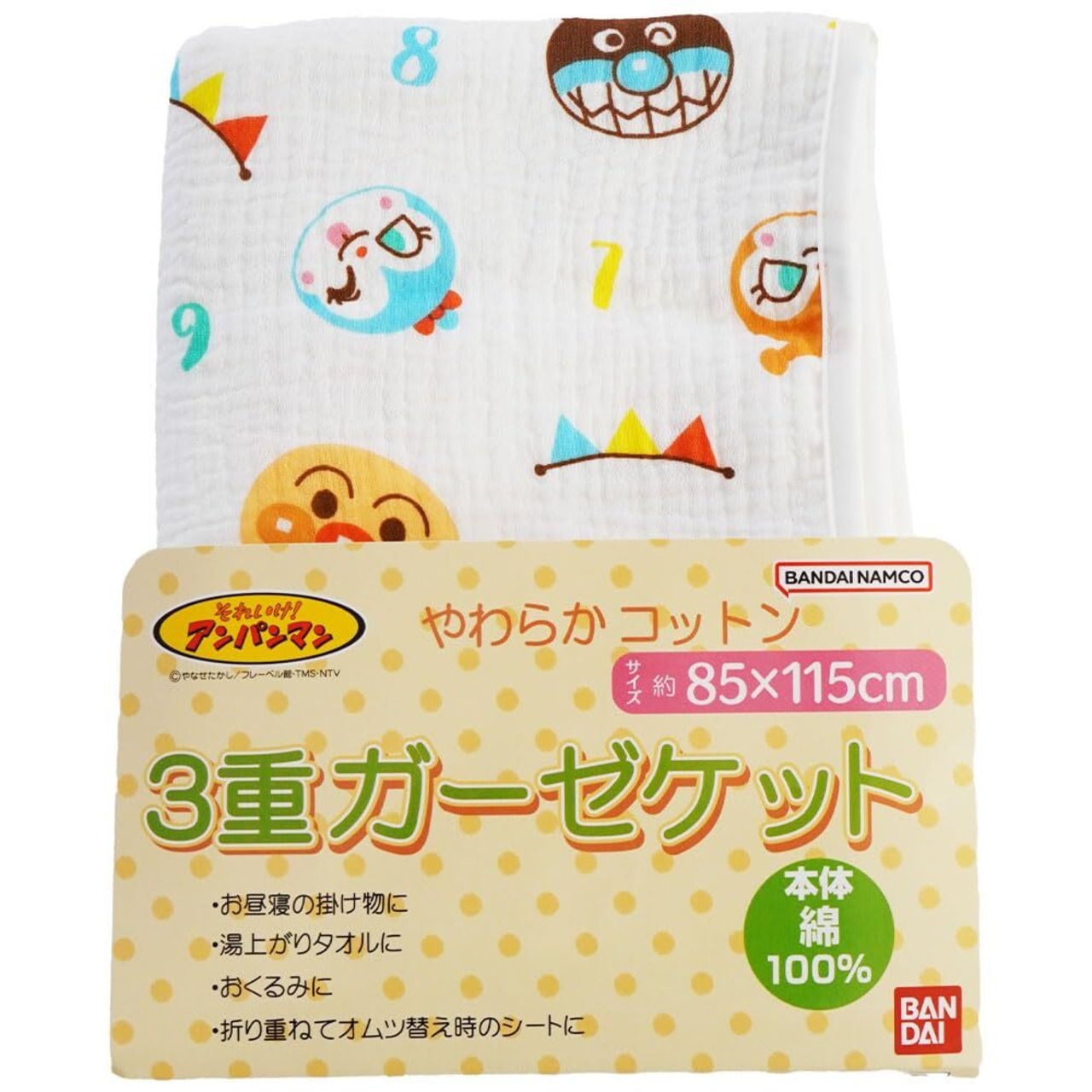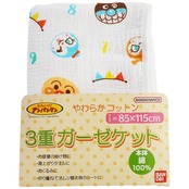 【子供のお昼寝タイムや保育園用に、大人気アンパンマンのガーゼケット!】天然素材のコットン(綿)100%で作られたガーゼケット。敏感なお肌にも安心吸水性も抜群なので、たくさん眠ってたくさん汗をかくこどもにぴったりな素材です。くしゅくしゅ感がかわいい3重ガーゼ生地。やわらかく、吸水力も抜群なガーゼはお昼寝ケットにピッタリ!湯上りタオルやおくるみとしてなど使い方はさまざま。産まれたすぐの赤ちゃんにも安心してお使いいただけます。もちろん、ご自宅の洗濯機で丸洗いOK!