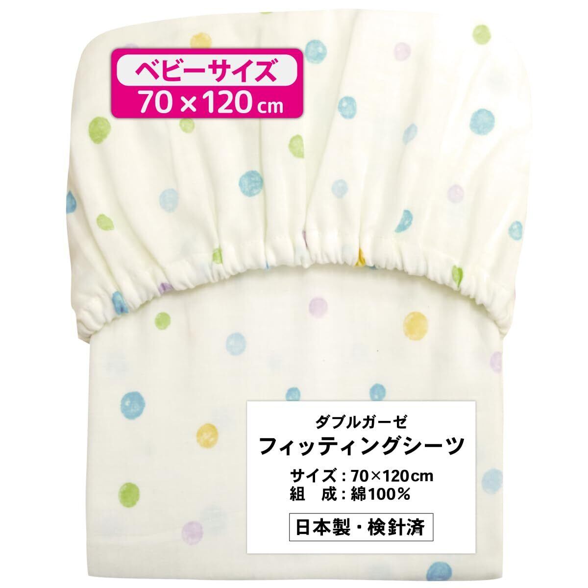 パステルカラーの水彩タッチのドット柄がかわいいフィッティングシーツです。赤ちゃんのお肌にやさしいコットン100%のダブルガーゼ素材です。洗うたびに肌なじみがUPします。