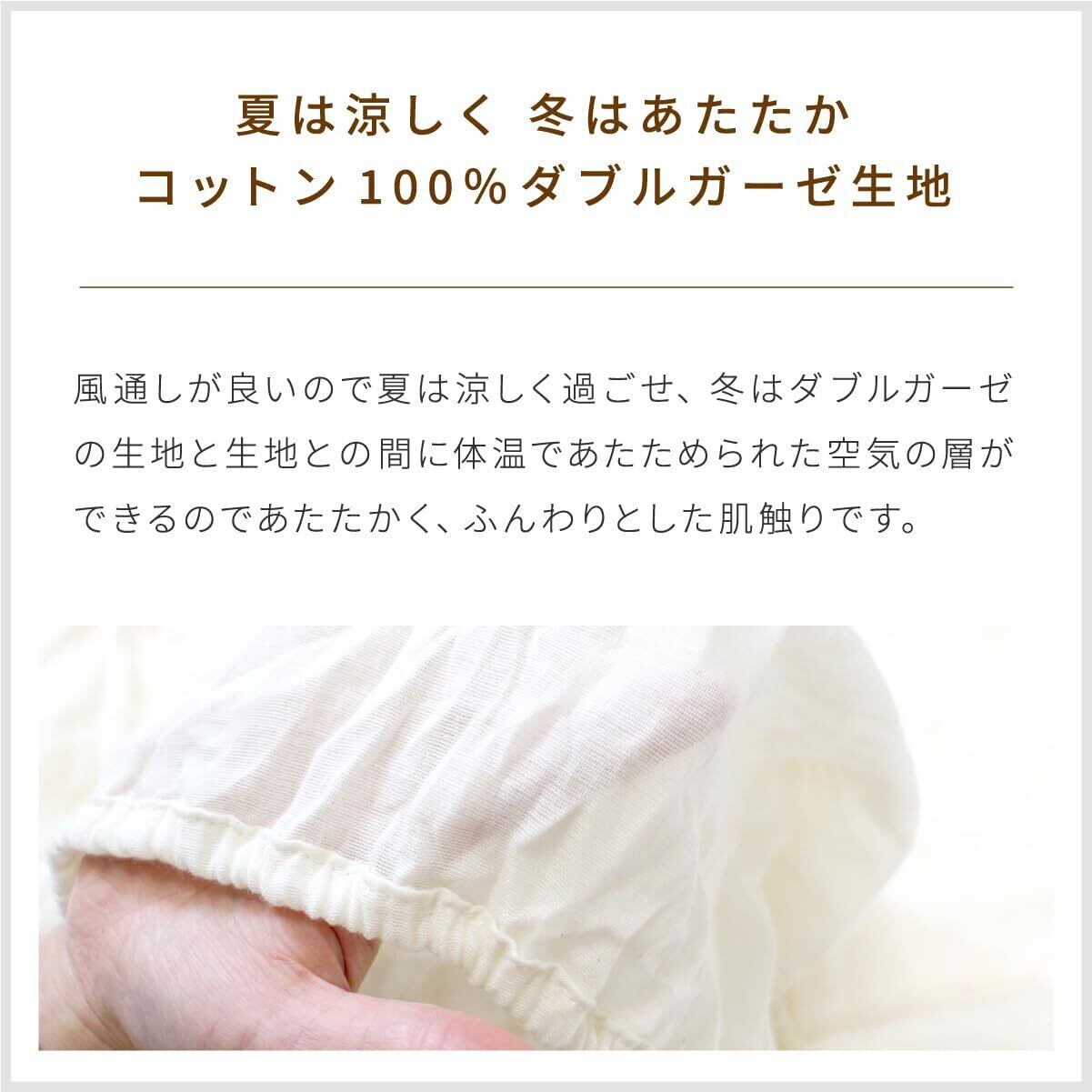 【ダブルガーゼ】ガーゼ生地の特徴は吸湿性と保温性に優れているところです。お洗濯後の乾きも早いので、気軽にお洗濯でき、洗うごとにやわらかくお肌になじみます。当店では、ガーゼを2重に重ねたダブルガーゼ生地を使用しています。風通しが良いので夏は涼しくすごせ、冬はダブルガーゼの生地と生地との間に体温で温められた空気の層ができるのであたたかく、ふんわりとした肌触りです。