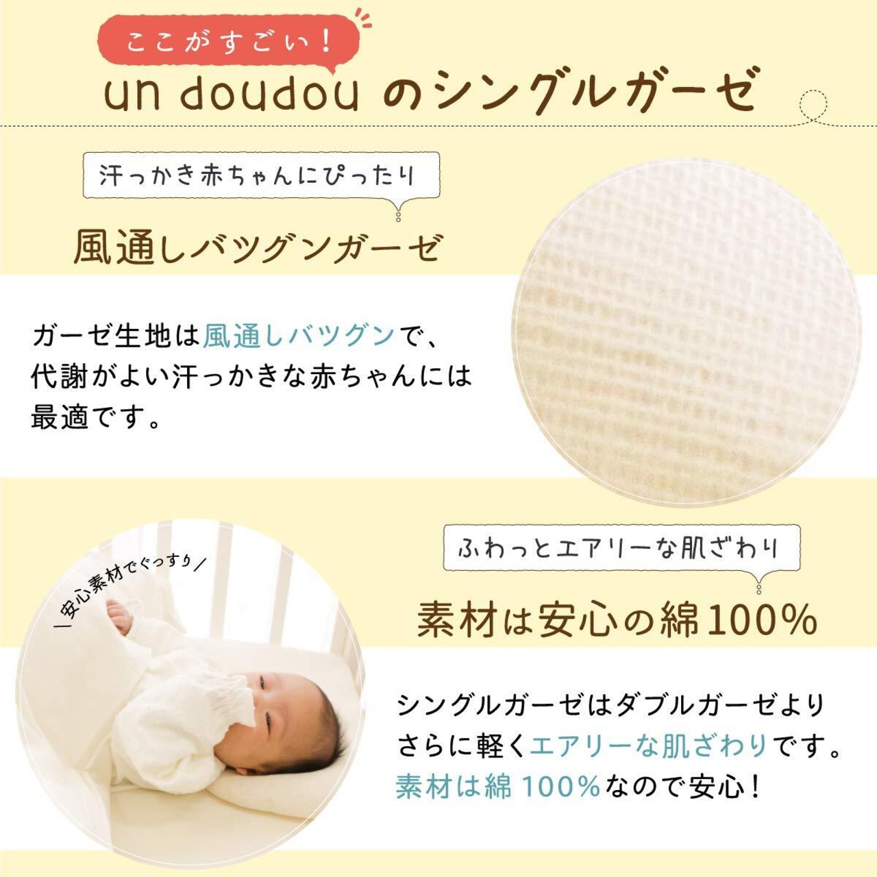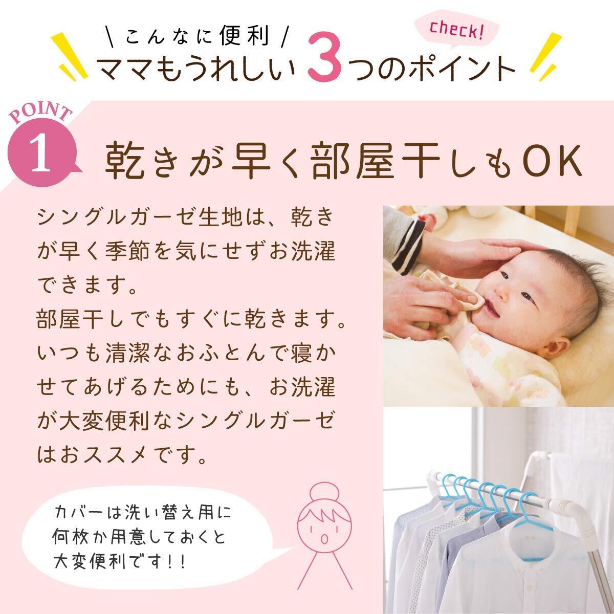 【シングルガーゼ】やさしいガーゼ素材なので、敏感な赤ちゃんのお肌にぴったり。薄手のシングルガーゼなのでとっても軽く、エアリーな肌触りです。お洗濯後の乾きが早く、忙しいママにも嬉しいポイント