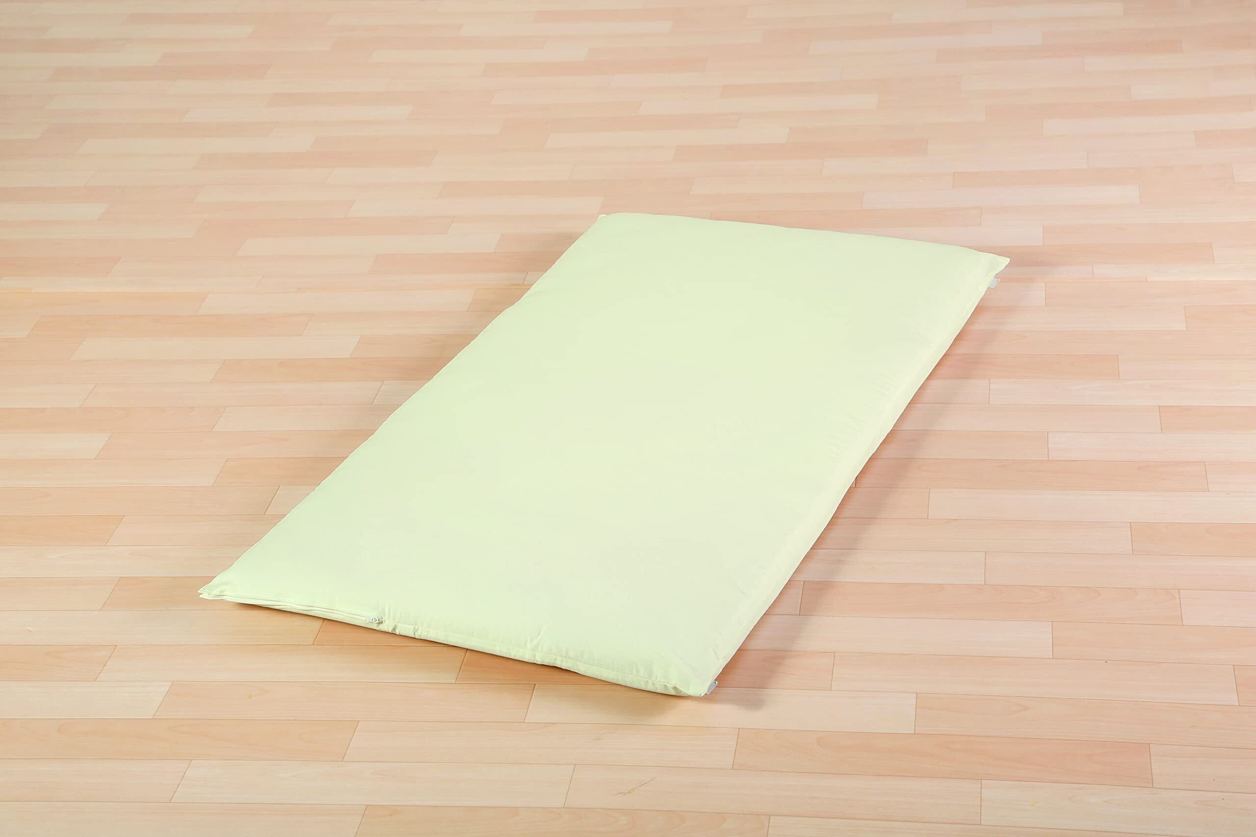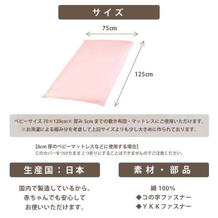 サイズ: ベビーサイズ (70×120cm対応)…約75×125cm ※厚み5cmまでの敷布団・マットレスにご使用いただけます。 ※お洗濯による縮み分を考慮して上記サイズよりも少し大きめに作られております。 【6cm厚のベビーマットレスなどに使用する場合】 このカバーをつけたまま2つ折りにすることはできませんのでご注意ください。