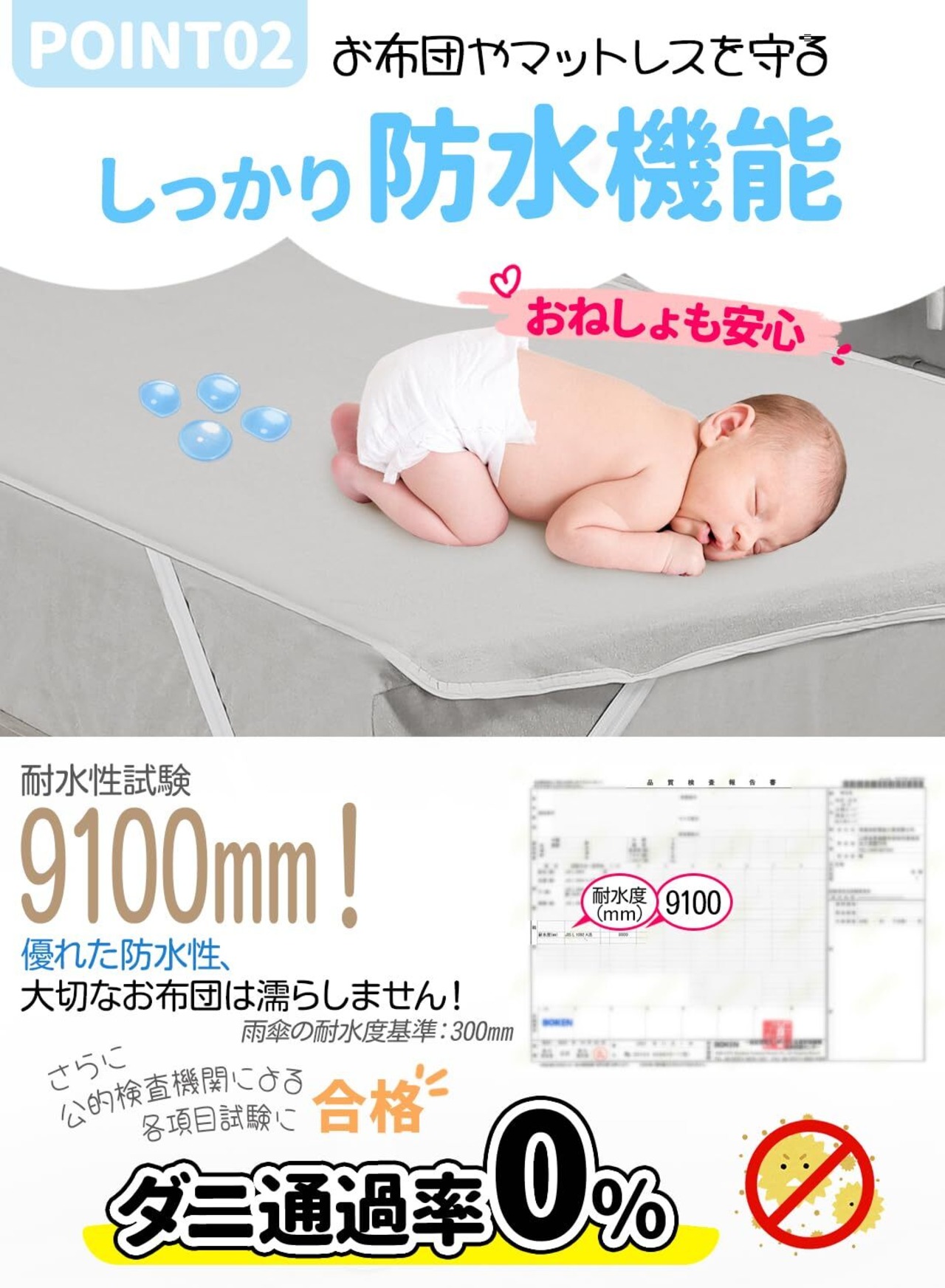 (ダニ予防にも効果的)寝汗や汚れを防ぐだけでなく、ダニの侵入もシャットアウト。公的検査機関によるダニ通過性試験ではダニ通過率0%を実証済みです。薬剤を一切使用していないため、お肌の敏感な赤ちゃんからご年配の方まで、安心してお使いいただけます。