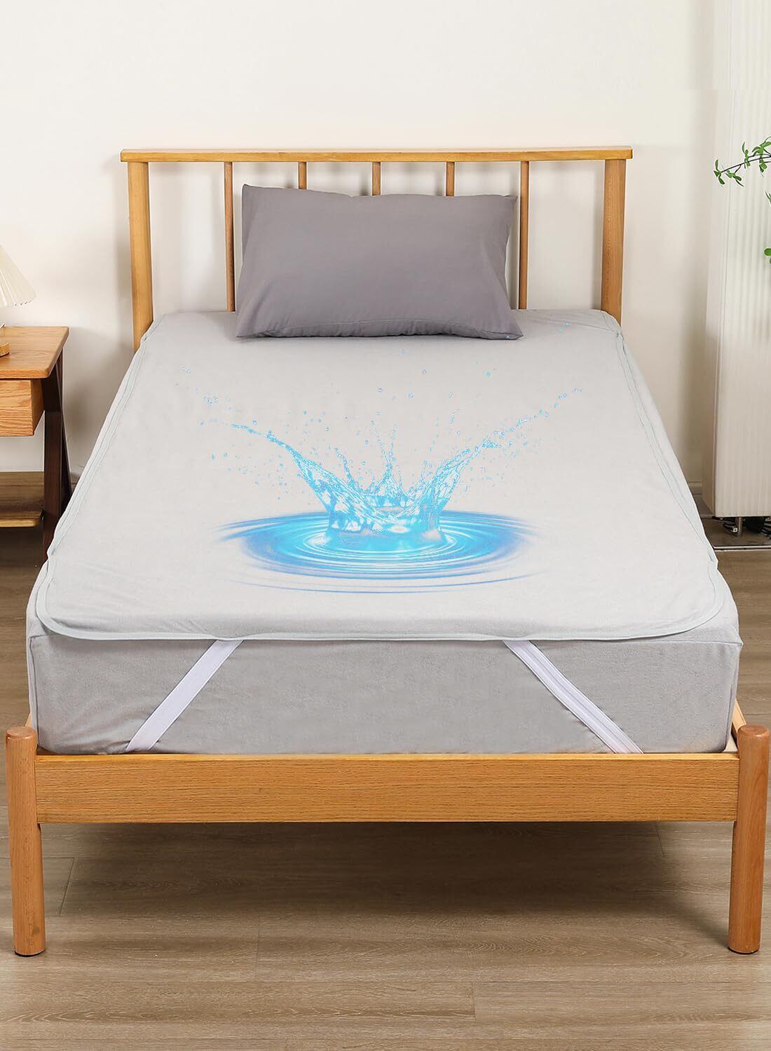 (安心の防水設計)この防水シーツは高い防水性を備えており、液体の浸透をしっかりと防ぎます。耐水度試験では 9100mm という優れた数値を記録しています(一般的な雨傘生地の基準は 300mm 以上)。おねしょや寝汗による敷布団の汚れを防ぎ、毎日安心してお使いいただけます。
