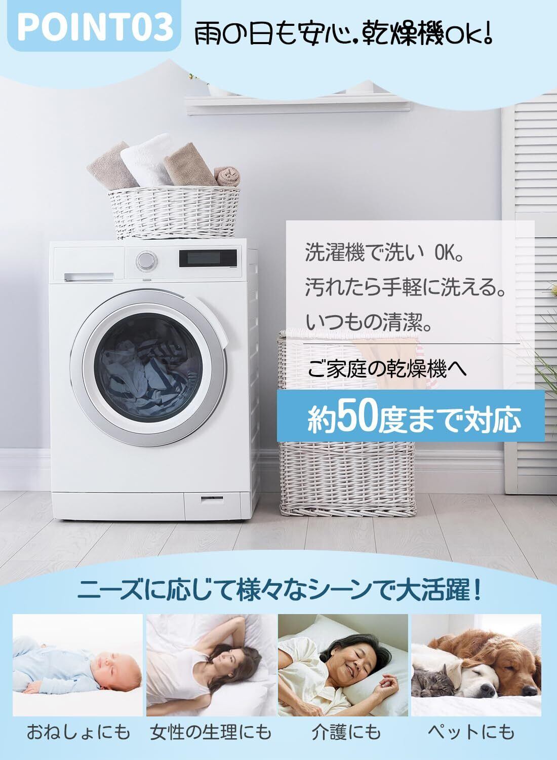 (お手入れカンタン乾燥機OK!)防水シーツは洗濯ネットを使用すれば洗濯機で丸洗い可能。汚れが気になったら、サッと取り外してすぐにお洗濯できます。 さらに乾燥機にも対応しているので、お手入れもラクラク。いつでも清潔に保てて、毎日快適な眠りをサポートします。