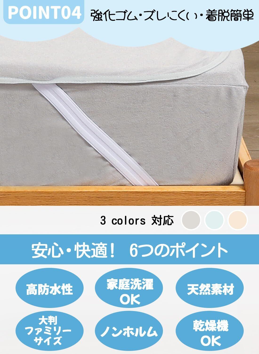 (おねしょ・寝汗・介護・ペットまで、幅広く活躍!)ふんわり心地よい綿100%パイル生地、肌ざわりの良いコットンパイル生地が、ふんわりやさしく体を包み込みます。柔らかな生地が寝汗をしっかり吸収し、お子様から大人まで朝まで快適な眠りをサポート。添い寝にもぴったりです。おねしょ対策もバッチリ!防水機能がしっかりしているので、おねしょをしても布団まで染みません。布団を干す手間や心配も減り、夜のおむつはずれトレーニングを始めるご家庭にもおすすめ。 事前に防水シーツを敷いておけば、ママも安心してぐっすり眠れます。お子様のおねしょ対策はもちろん、介護用途や女性の生理時の対策にも。さらにペット用のシートとしても便利で、お布団・ベッドだけでなく、ソファーや車のシートにも幅広く活用されています。コンパクトにたたんで持ち運べるので、旅行先や帰省時にも大活躍です。