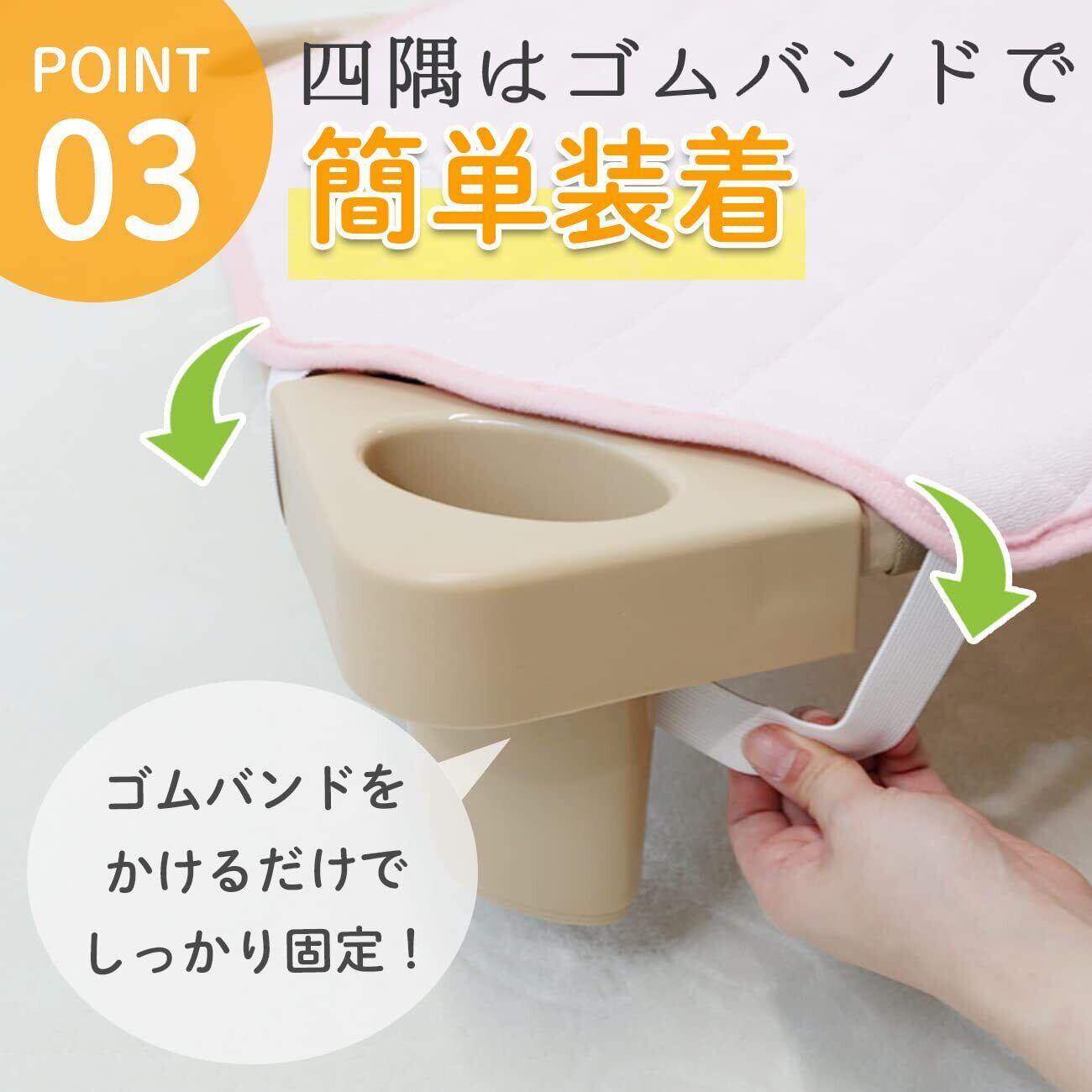 【四隅ゴムバンド付き】コットカバーの四隅にはゴムバンドが付いているので、コットへの装着も簡単しっかり固定できるので寝相が心配なお子様でも安心です。