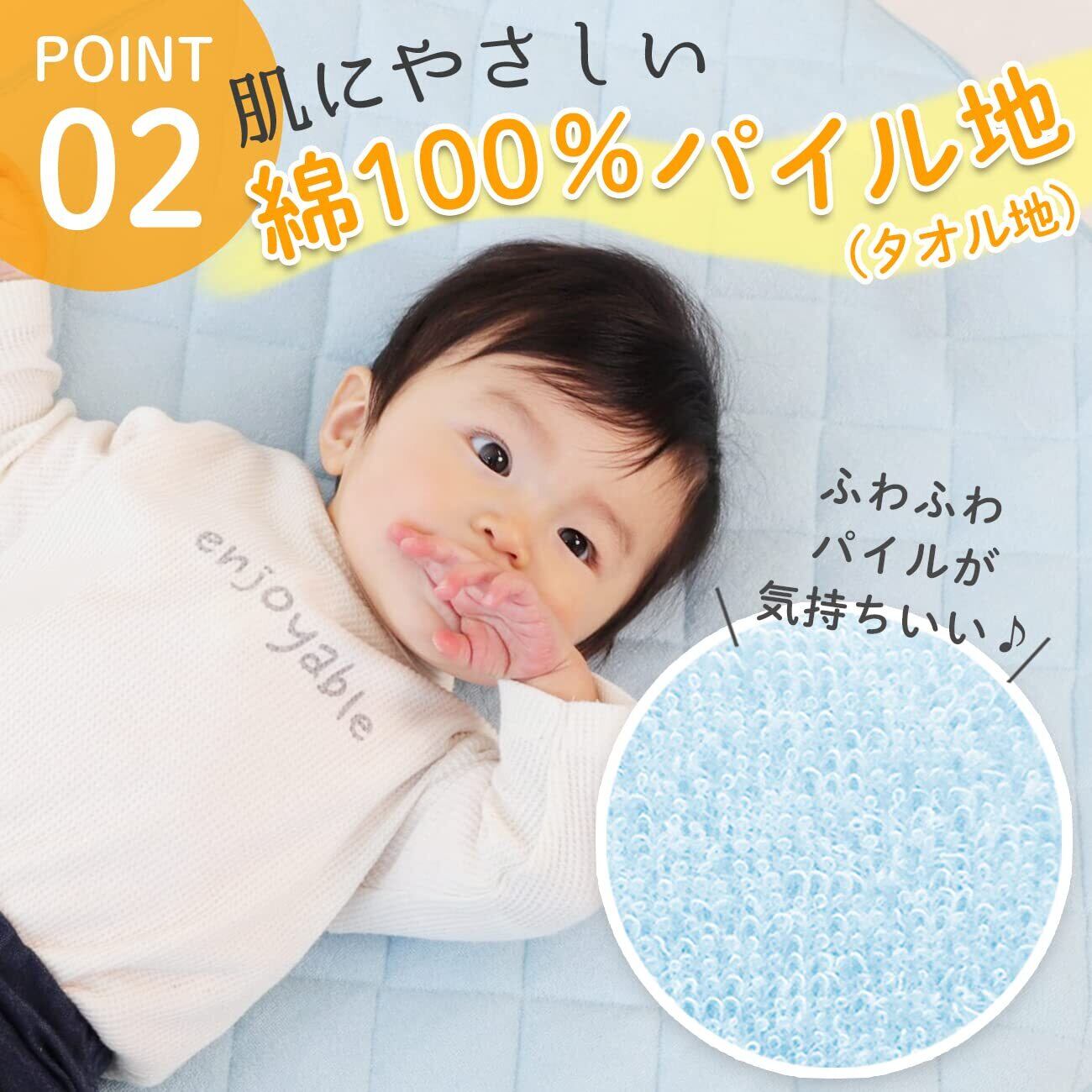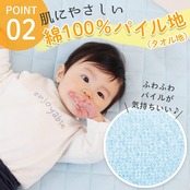 【肌に優しいコットン100%】コットカバーの表生地は、肌に優しいコットン100%。子どもが直接触れる生地なので、ふわふわ気持ちいいパイル地を採用しています。